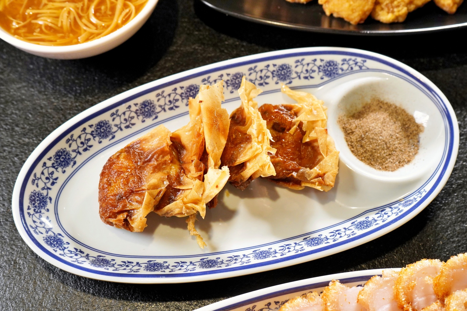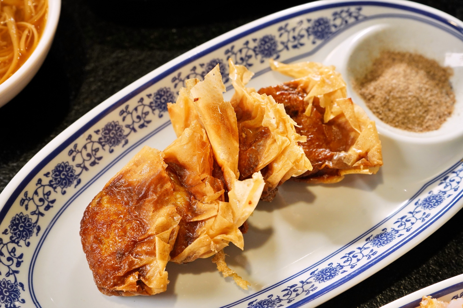 像這道剝椒酥炸雞是以千張包入剝皮辣椒雞肉,入口有點像是乾煎版的餛飩,外層超酥、內餡香辣微甜,帶有剝皮辣椒勾人的細緻辣度,還蠻值得一試!分享給你們參考哦~