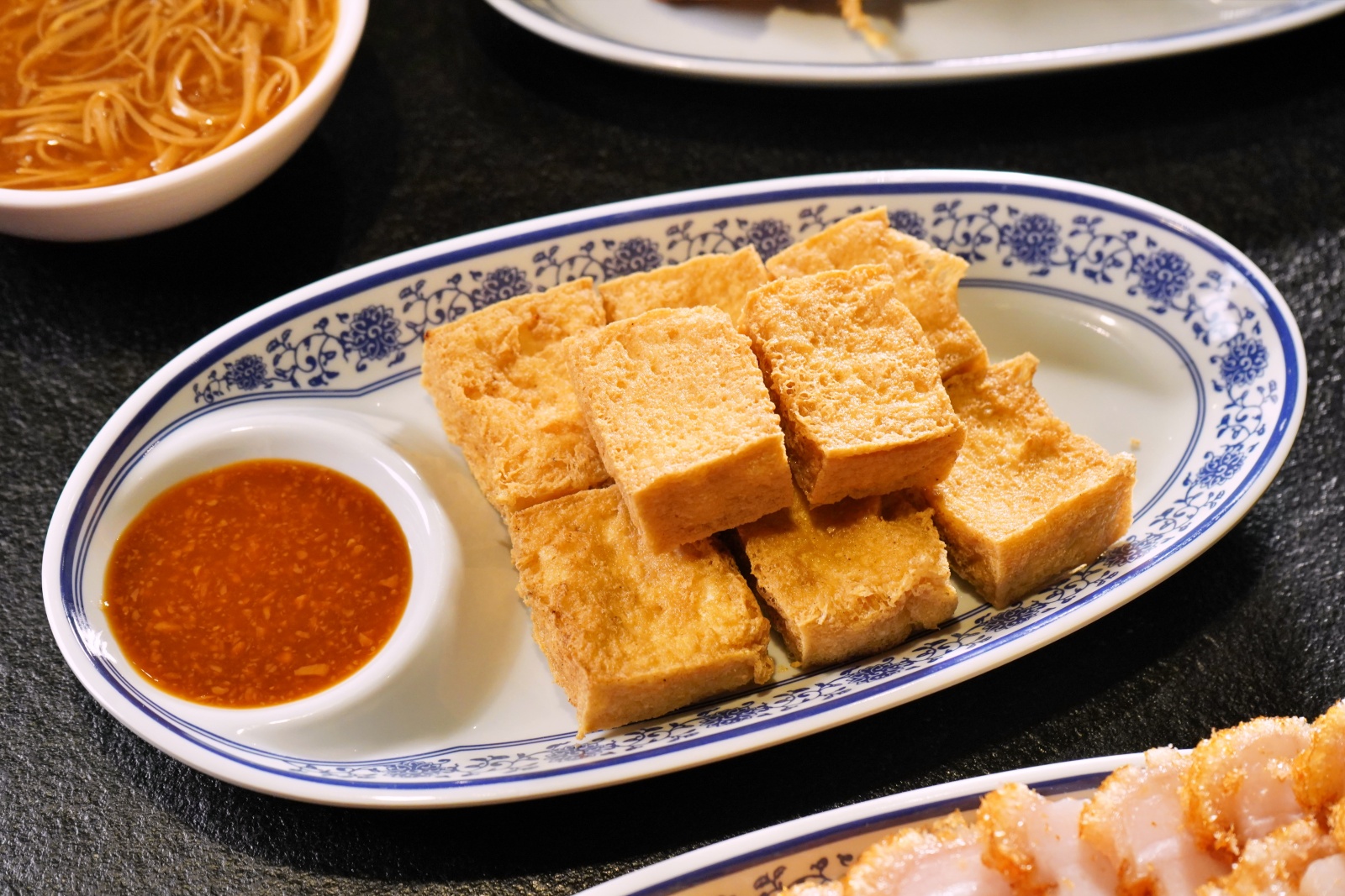 台式金酥炸豆腐的外皮炸得金黃酥脆、內裡綿密滑嫩,一口咬下外酥內滑,搭配台式蒜蓉醬就很夠味。