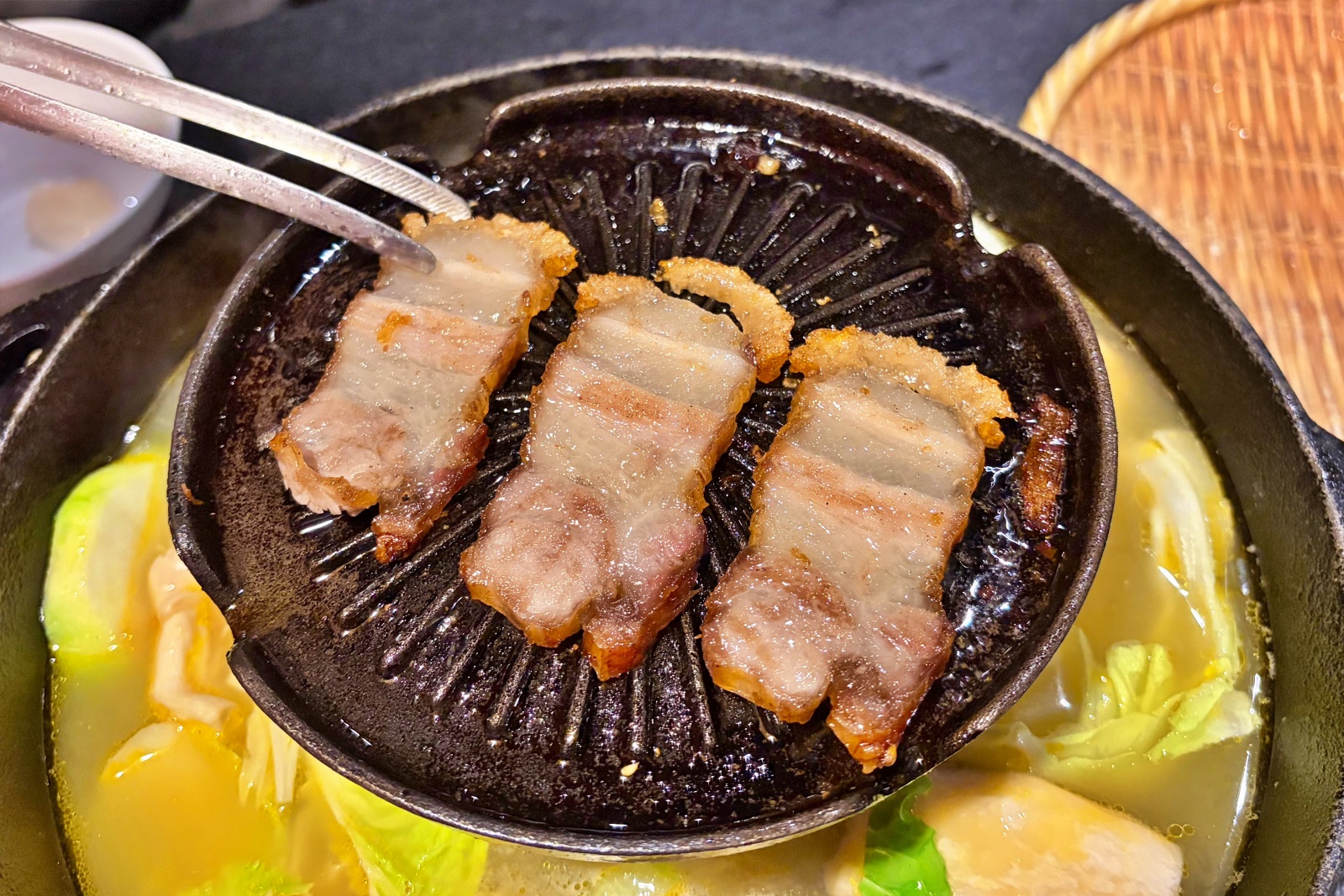 必須要說這次尚石苑與有利脆皮豬聯名的火烤石鍋真的很厲害!脆皮豬上桌時本身就是半熟的狀態,所以我們放上烤盤很快就烤熟了。