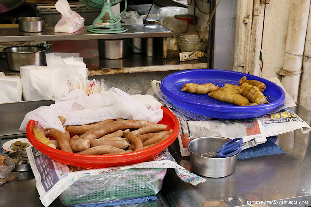 粉腸是以豬小腸灌入番薯粉與豬肉,裡頭的豬肉塊份量還不少,吃起來頗有嚼勁。