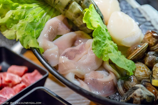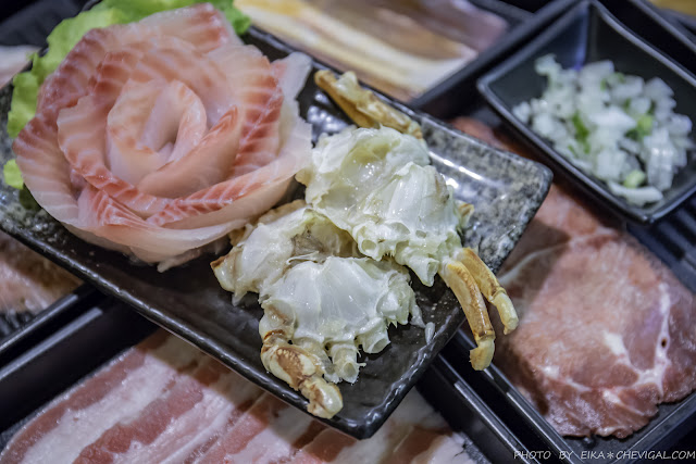 海鮮類的品項則有鯛魚片與蟹身,不過這鯛魚片的擺盤也太讓我們驚豔了,竟然有著在某些火鍋店與日式料理店才看得到的玫瑰花造型,整個美到捨不得煮啊~