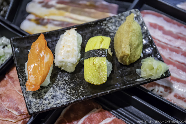 海鮮的部份,除了基本的黃金大蛤蠣、特選小卷與薄鹽鯖魚片,因為我們這天也是選擇690元的用餐模式,還會另外直接再依照用餐人數免費送上北海道干貝與草蝦唷!