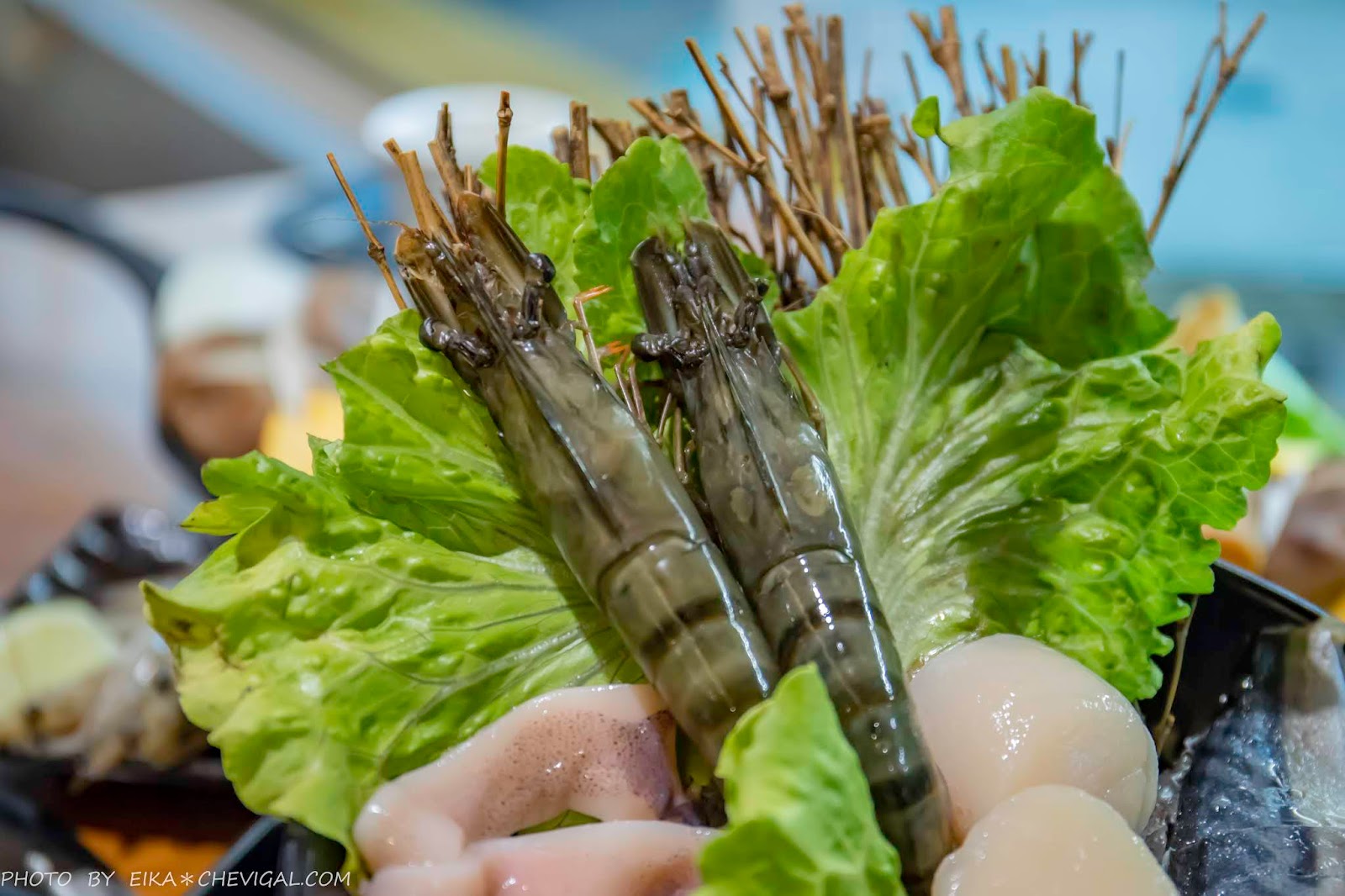 干貝為生食等級,多汁鮮甜的風味都鎖在富有彈性的肉質裡頭;而新蝦草蝦看起來特別透亮,烤熟後格外香甜。