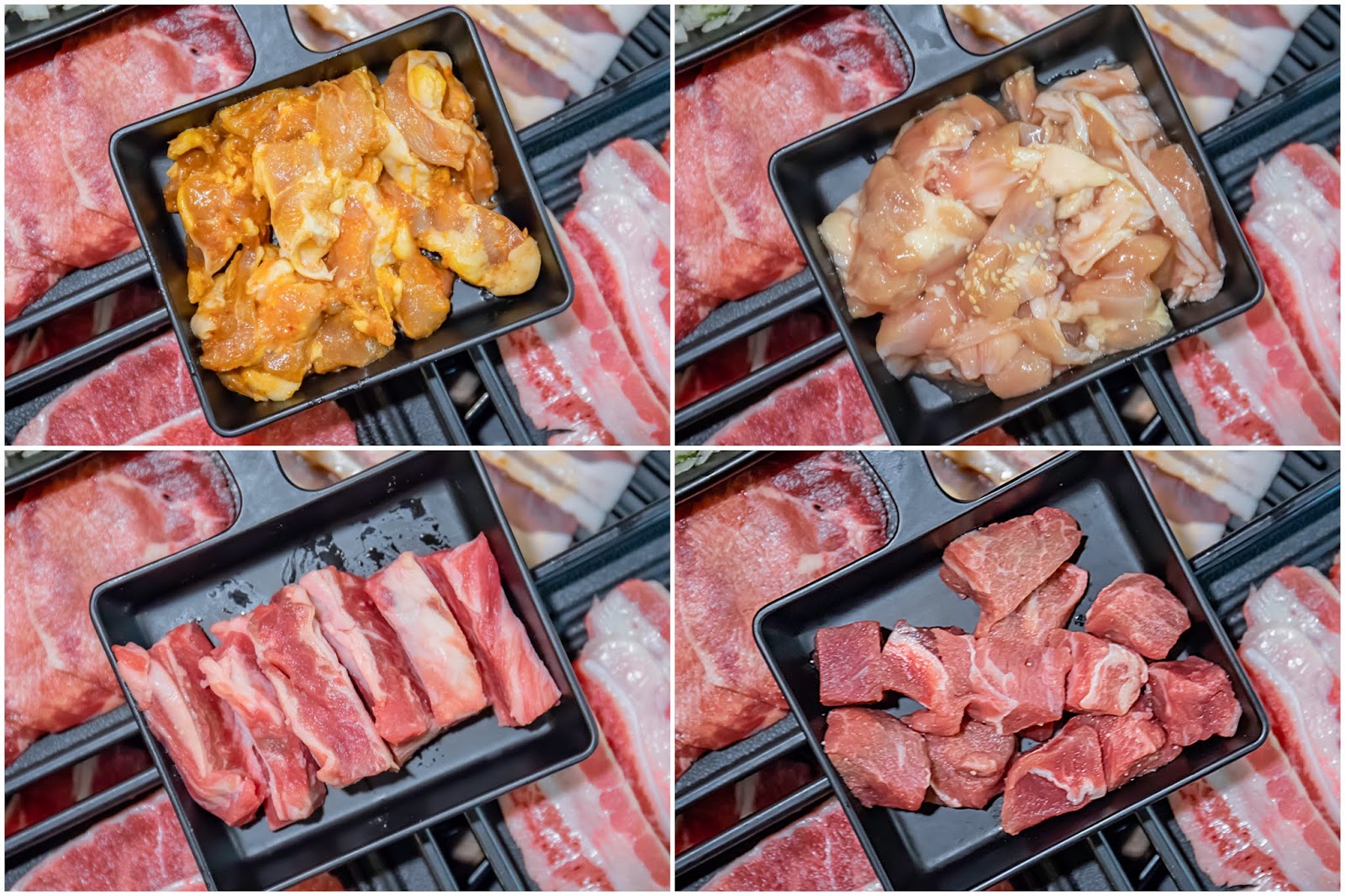 這裡的肉品主要有豬肉、牛肉與雞肉,加起上差不多有20種,沒想到今晚差點梭哈,真的很會吃……第一波送上來的是低脂板腱牛、原味牛五花、特選松阪豬與手工極上牛舌。