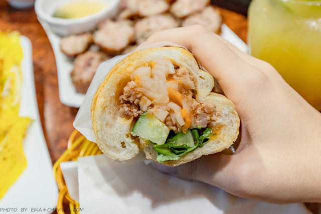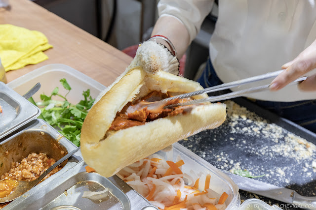 打拋豬法國麵包$85元,選用的法國麵包口感外酥內軟,裡面還包有各式清脆爽口的食材;初次造訪時我們點的是太陽蛋口味,但我們更愛這次二訪的打拋豬口味,香辣風味讓整份法國麵包吃起來更有層次!