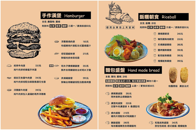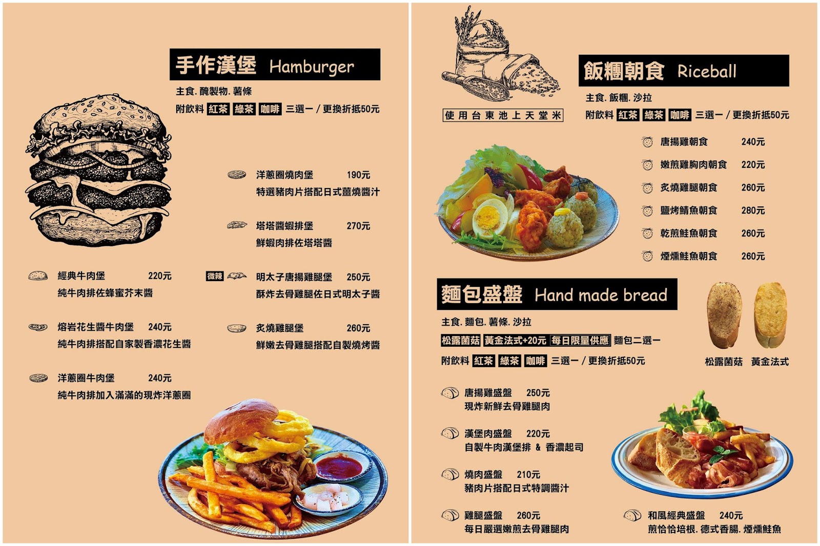 這裡提供初綠餐廳的菜單給你們參考,以早午餐系列來說,手作漢堡、飯糰朝食、麵包盛盤都是人氣品項,分別搭配不同的副食,均附飲料三選一,飲品升級還可折抵50元。
