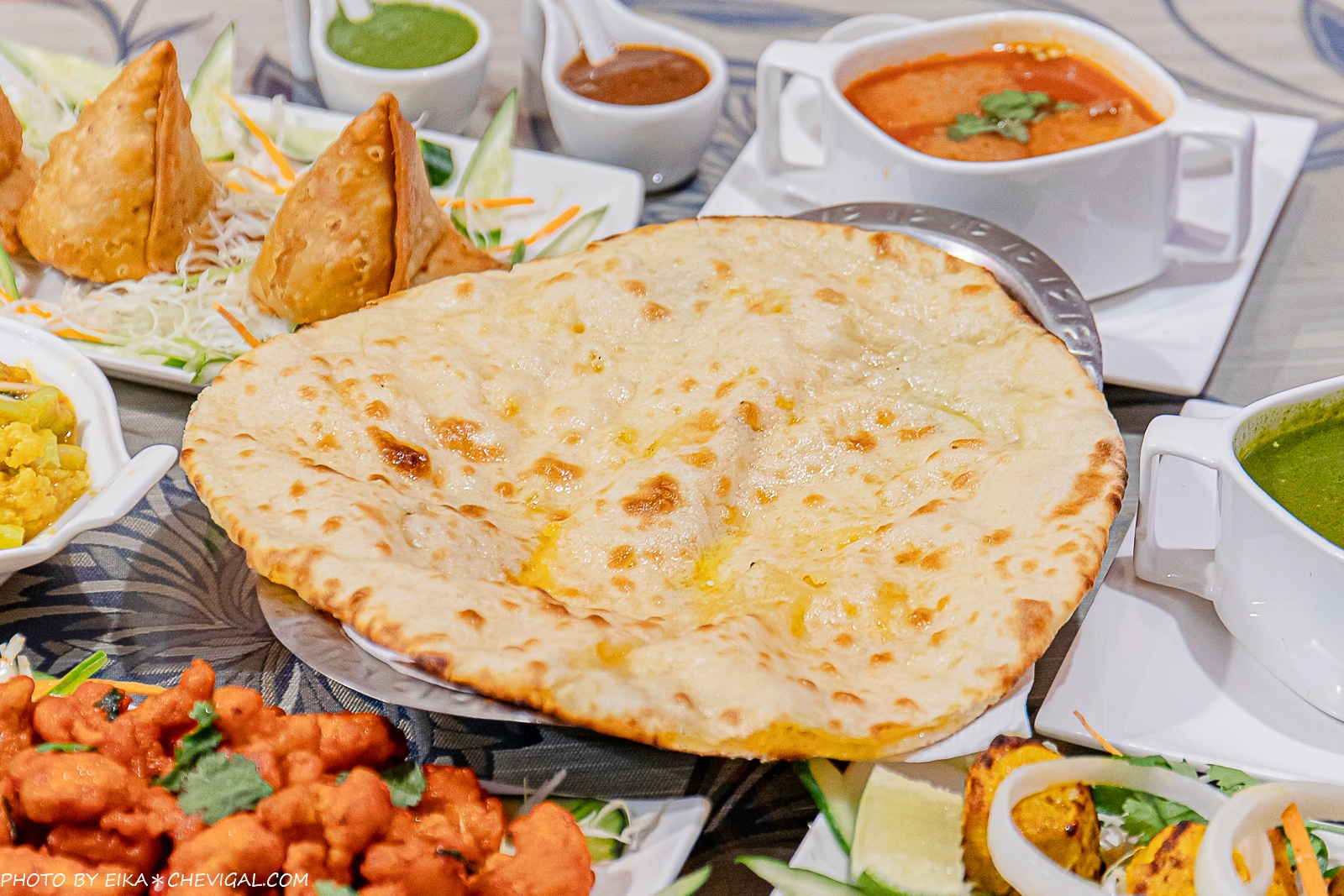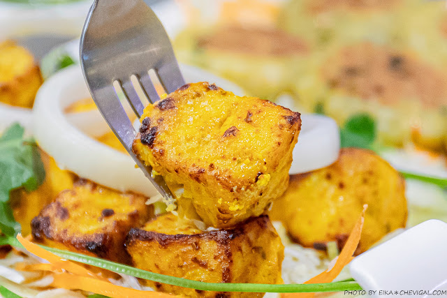 印度奶酪烤餅$110元,來吃印度料理自然不能少了最經典的烤餅,這款印度奶酪烤餅是近期推出的新品~原本的我們實在很難想像奶酪到底要如何與烤餅結合在一起,後來發現其實比較接近起司口味,吃起來有著淡淡的奶香,還能吃到最單純的餅皮香氣,單吃或搭配各種咖哩都很不錯。