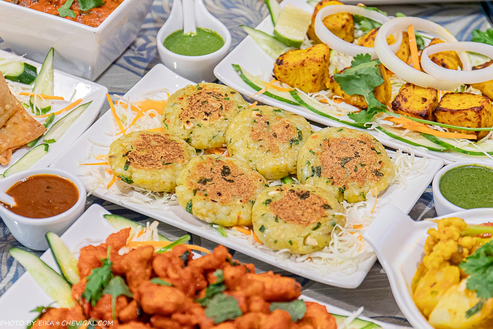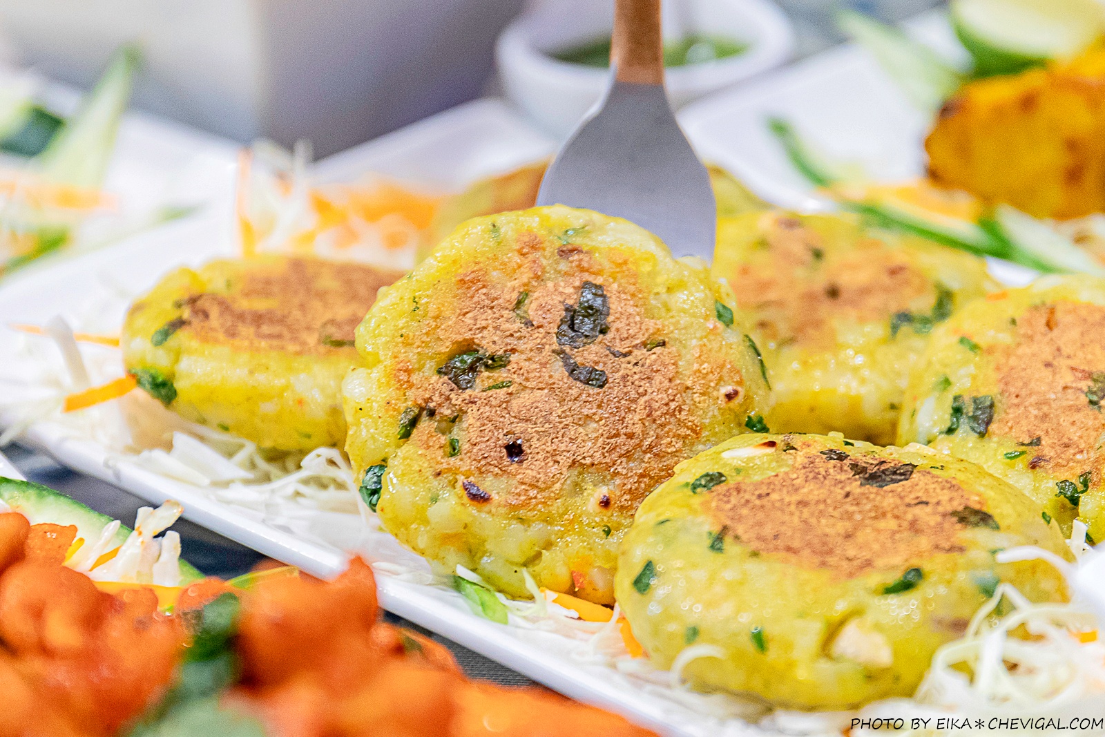 Aloo tikki $420元,這道也是最近推出的新菜色,在中文裡似乎沒有相對應的用詞,不過在北印度可以說是相當常見的小吃。主要是以馬鈴薯、豌豆與各種咖哩香料製作成小圓餅的形狀,再經過油炸固定成形。