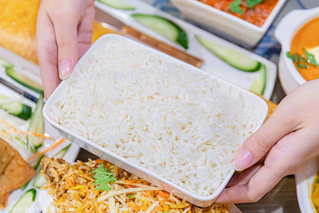 印式白米飯$60元,因為前面三道咖哩的份量都還蠻多的,所以我們另外點了一份印式白米飯來搭配,看起來比較像是長米,吃起來口感分明不黏膩,而且還帶點QQ的彈性。
