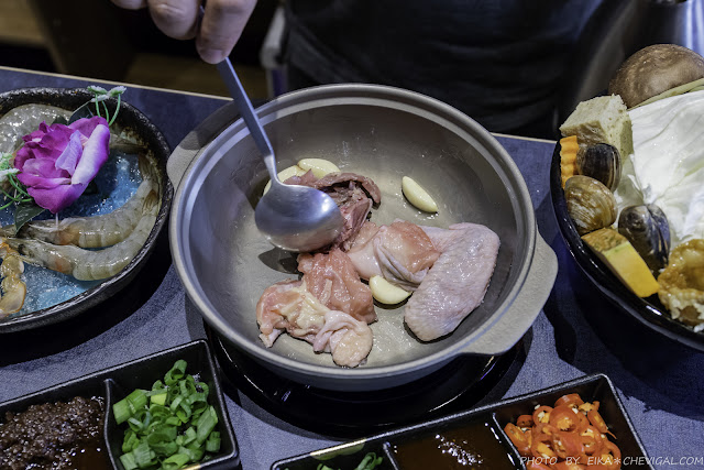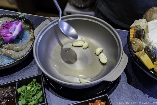 星八六腳雙拼鍋 (蛤蜊、嫩肩牛肉、櫻桃鴨胸、放山土雞) $558元,相較於一般石頭火鍋店直接送上煮好的湯鍋,在這裡你們可以看到湯鍋的真材實料,以蒜頭爆香、拌炒、倒入高湯的動作一氣呵成。