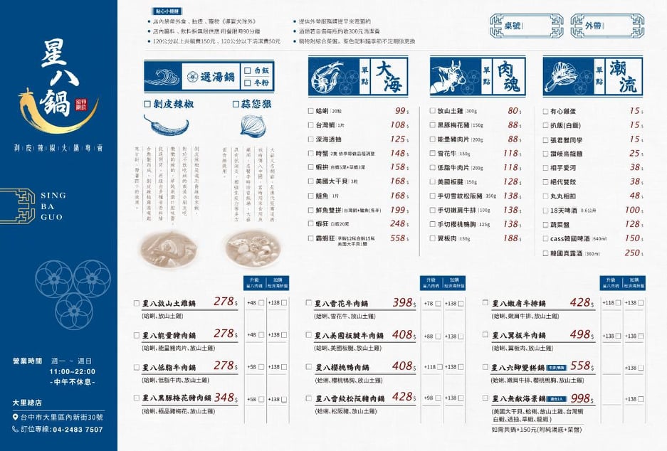 點餐的方式淺顯易懂,首先先選擇你們想吃的湯鍋與主食,再看到下方決定想吃的肉品與海鮮組合,皆能升級為星八肉魂、加購蝦兵蟹將,還能單點各項海鮮、肉品、飲品與特色火鍋料。