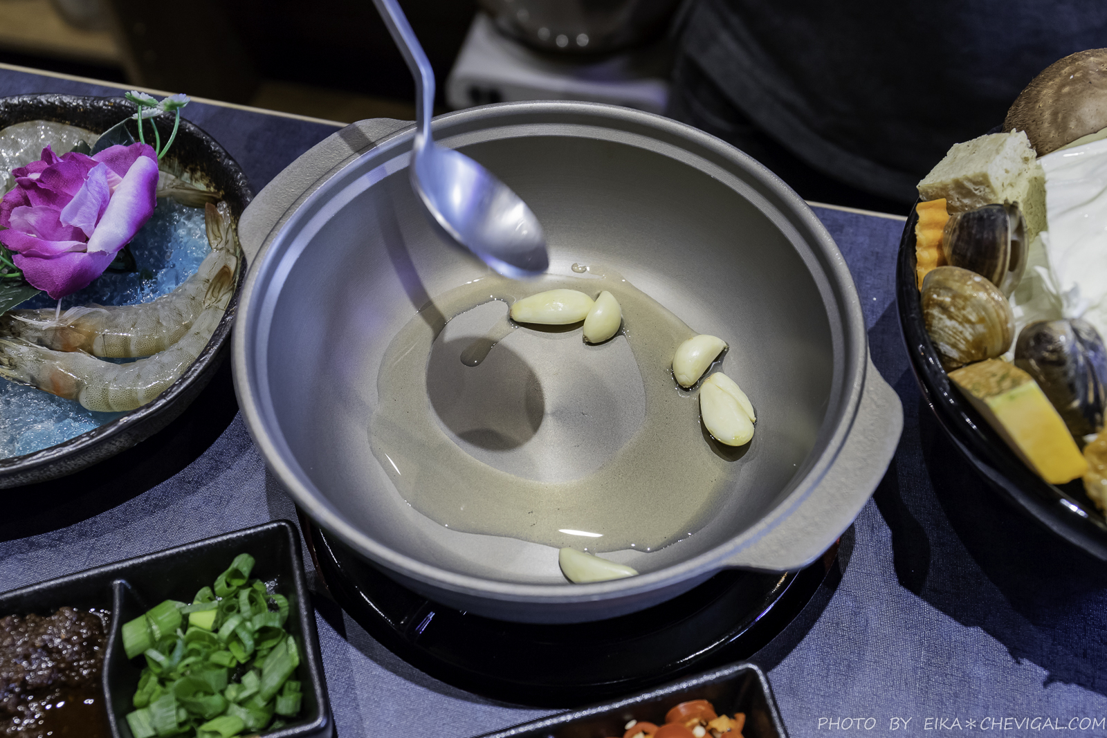 星八六腳雙拼鍋 (蛤蜊、嫩肩牛肉、櫻桃鴨胸、放山土雞) $558元,相較於一般石頭火鍋店直接送上煮好的湯鍋,在這裡你們可以看到湯鍋的真材實料,以蒜頭爆香、拌炒、倒入高湯的動作一氣呵成。