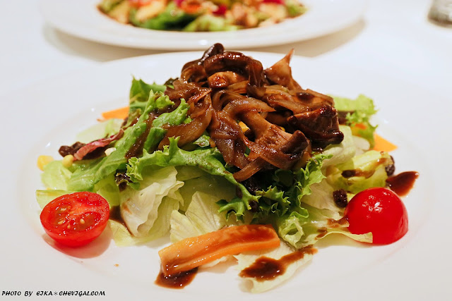 特別的是,這道餐點是以巴薩米可醋醬調味,使得整份沙拉吃來鹹中帶甜,尾韻帶點微酸,十分開胃。