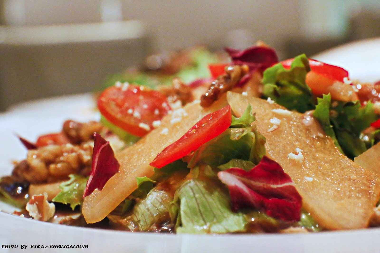特別的是,這道餐點是以巴薩米可醋醬調味,使得整份沙拉吃來鹹中帶甜,尾韻帶點微酸,十分開胃。