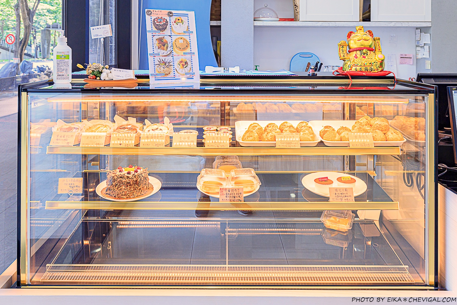 櫥窗內有販售多種口味的重乳酪蛋糕、提拉米蘇、香草泡芙、巧克力泡芙,以及目前台中獨家販售的米蘭諾布丁!不少中興大學的學生都會來買他們家的泡芙,冰過的外皮依然酥脆,而且一顆只要$18元,多買幾顆回家也不心疼。