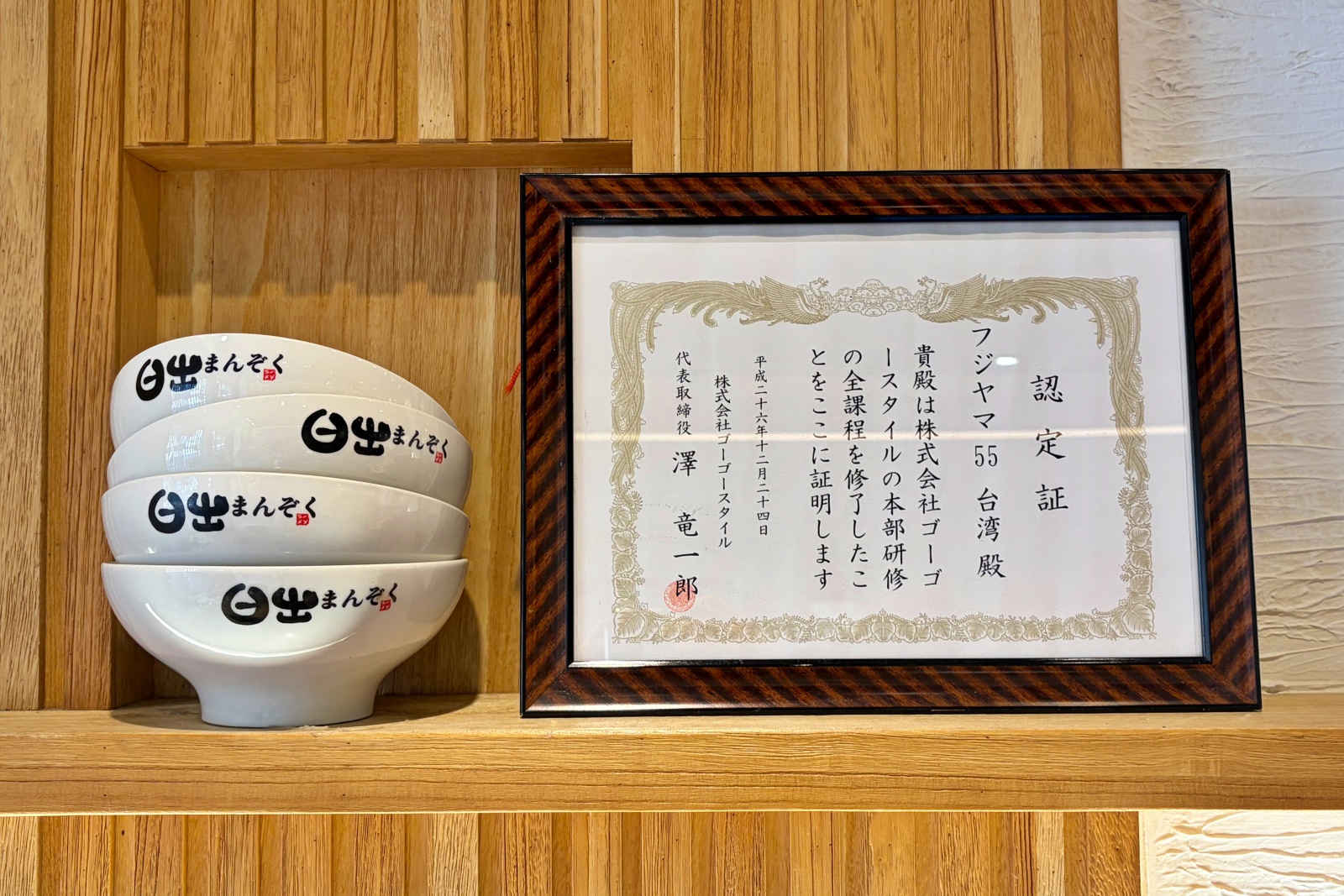 店內架上展示著老闆在富士山 55 拉麵時期,親赴日本研修的證明,而且老闆本身也擁有京都拉麵調理師認證,長年累積的日式拉麵功底,讓人對他們家的拉麵自然多了幾分期待。