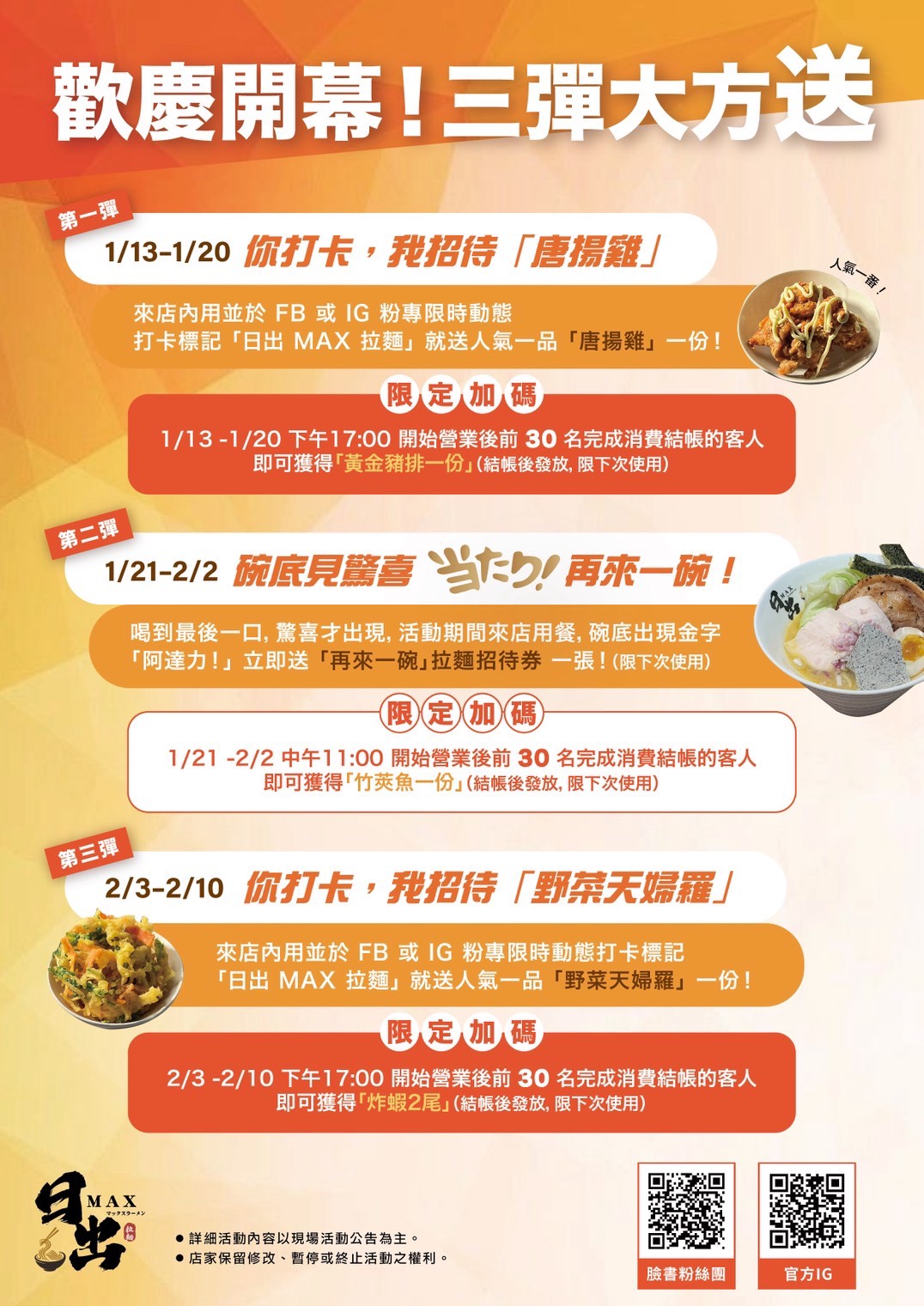 歡慶開幕還有優惠大方送!目前最狂的就是「碗底見驚喜」,只要在期間內到店用餐,吃到碗底出現金字,就送「再來一碗」拉麵招待券(限下次使用),趕緊和家人朋友來試試手氣吧!