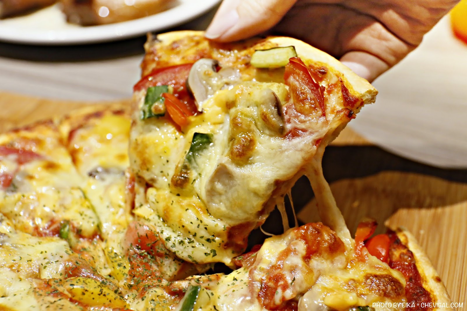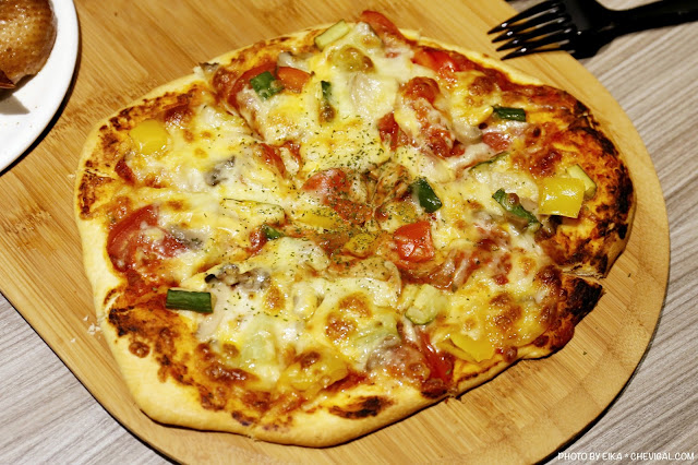 整體的食材有番茄、黃瓜、菇類、彩椒等等,起司還會牽絲!披薩的口感、調味都很不錯,麵皮的Q勁剛好,忍不住讓人一片接一片。相較於一般夜景咖啡常選用的冷凍披薩來說,好吃度整個加分!不過價位相對較高,這點就見仁見智囉~