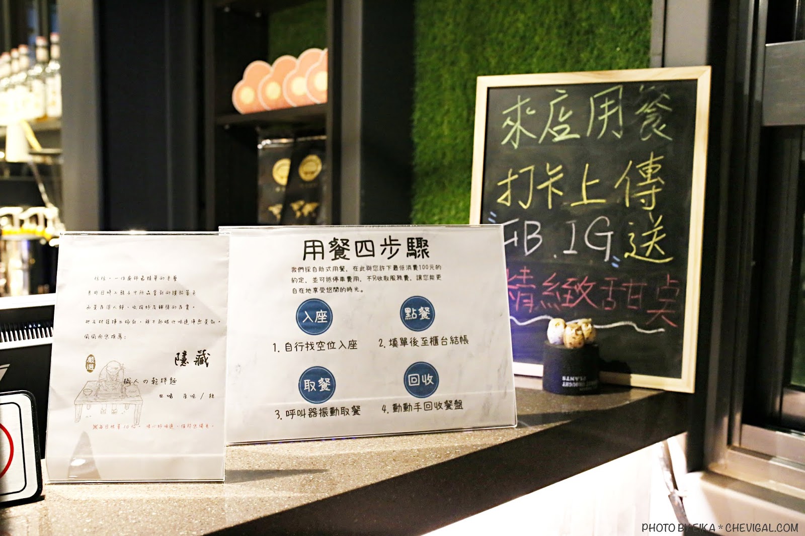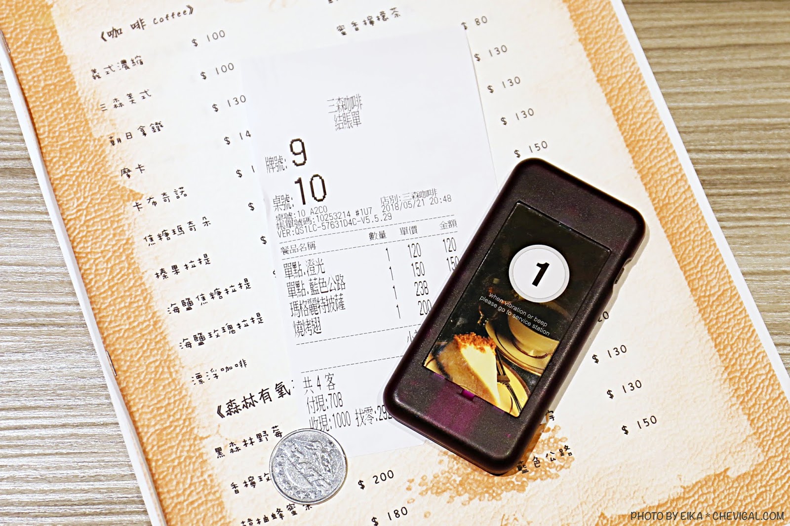 至一樓點完餐點之後,會拿到一台震動叫號器,通知客人自行取餐;店家也會詢問是否有停車,另外會提供一枚代幣出入。