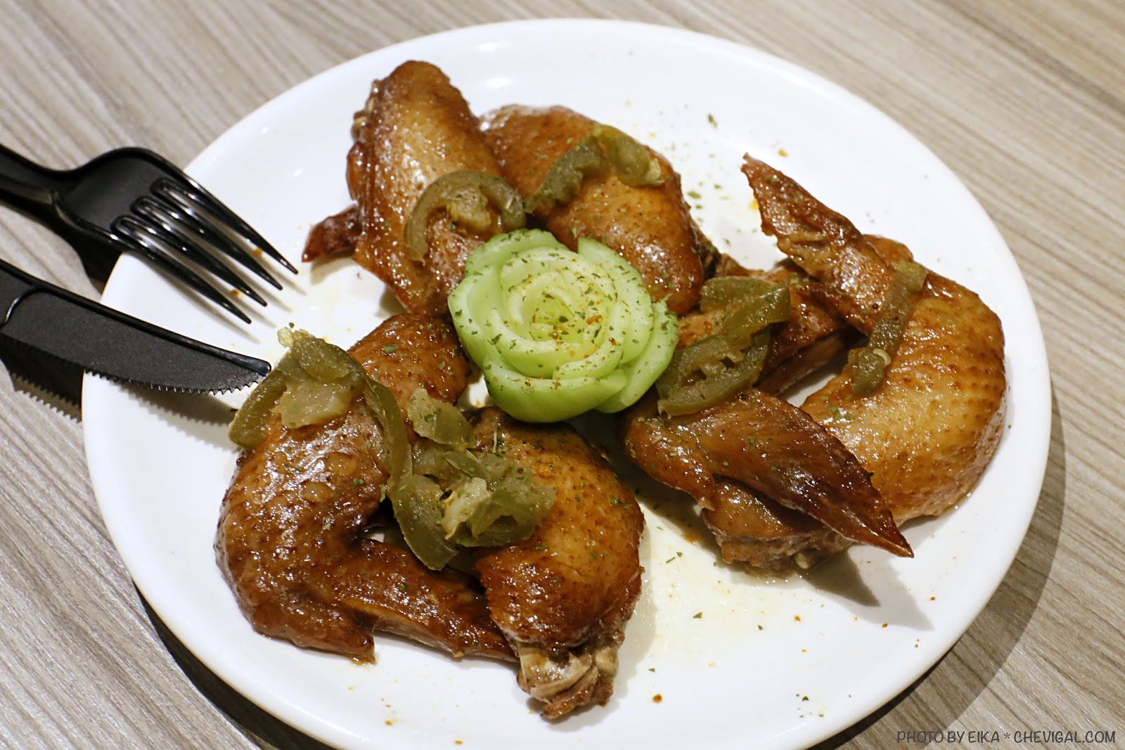 主廚秘密烤雞翅是每日限量,還好這天還有供應~一份共有六隻雞翅,吃來入味又軟嫩多汁;如果喜歡清爽口味的朋友,可以搭配上面的酸黃瓜一起吃,只是酸度頗高,我們真的凍美條……單吃雞翅就很好吃了XD