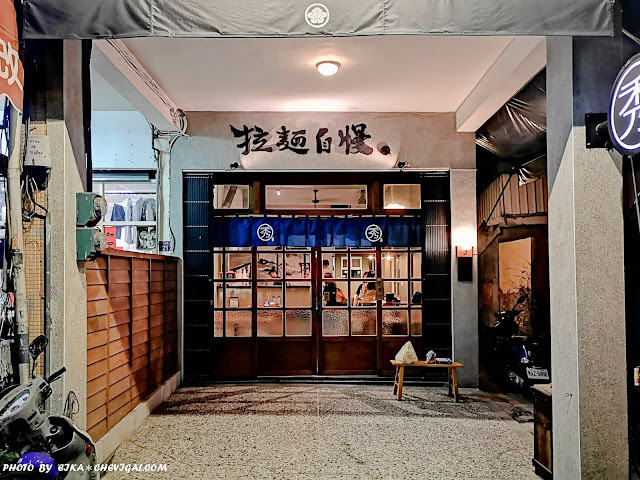 復古日式的木造門扇,上頭可以清楚地看到「拉麵自慢」四個大字,彷彿在訴說著職人的自信與專注。雖然西屯路本身的停車格比較不好找,不過店家旁邊的空地也有開放給客人停車,其實還蠻方便的。