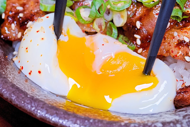 劃開半熟蛋後,可以看到傾洩而出的蛋液,拌入燒豚飯後更加潤口香甜,真的是好犯規啊>///<