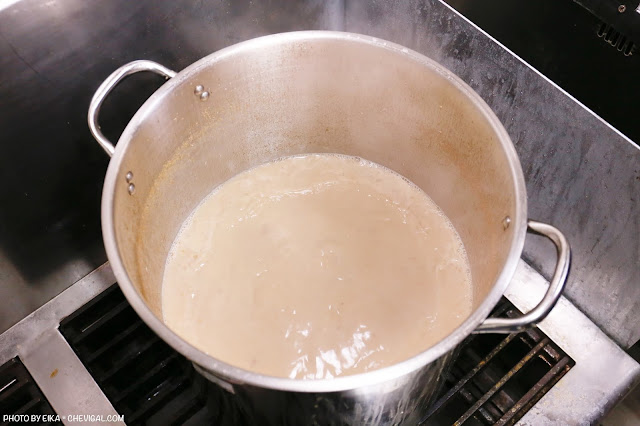 秀麵尊是以豚骨高湯做為店內拉麵的湯頭基底,首先需要以大火熬煮長達六小時,才會呈現偏向乳白色的色澤;再經過半天的靜置後,還會再陸續調整濃度及增加豚骨深度,光是熬煮好一整鍋湯頭就需要超過整整24小時的時間,十分費工。