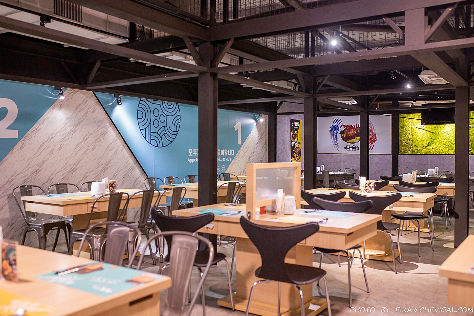 店內帶有類似工業風的風格,簡潔鮮明的配色與寬敞的桌間距離,讓人用餐感到放鬆不壓迫,背後的牆面上還能偷偷看到可愛海鮮的插圖,整個萌感十足!