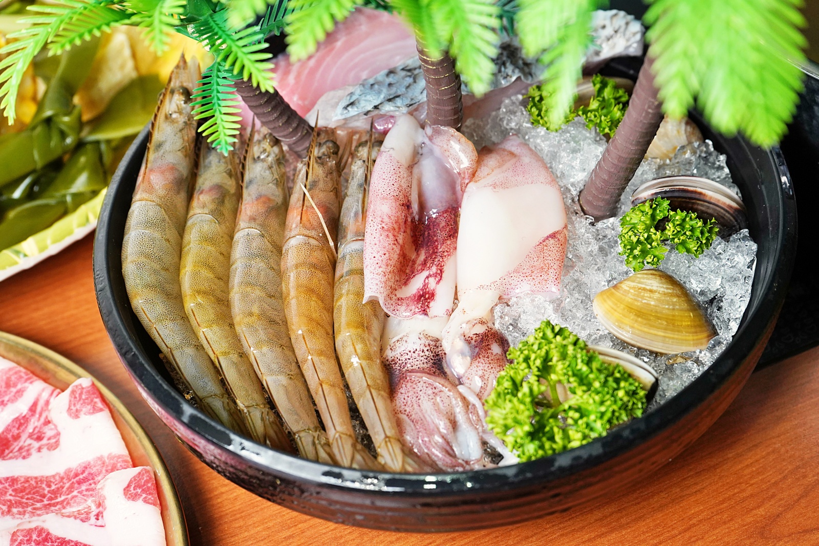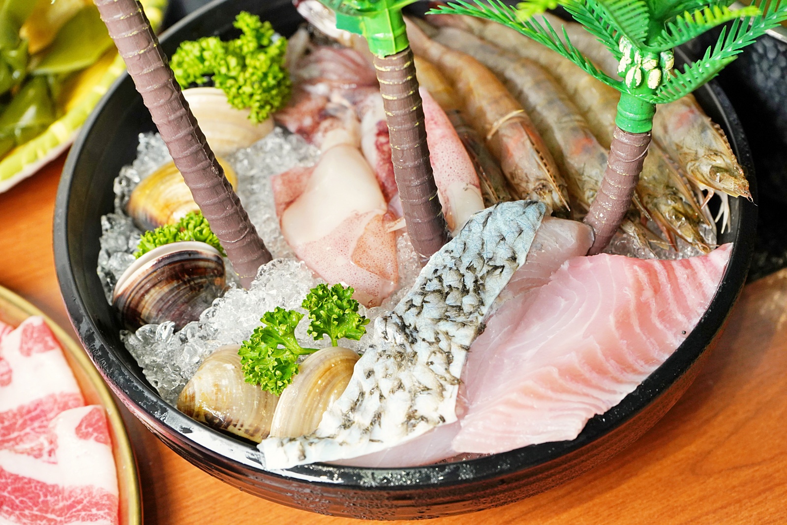 整份海鮮拼盤包含了鮮嫩小卷、鮮嫩白蝦、綜合魚片與現撈蛤蜊,一次就能吃到多種海鮮。