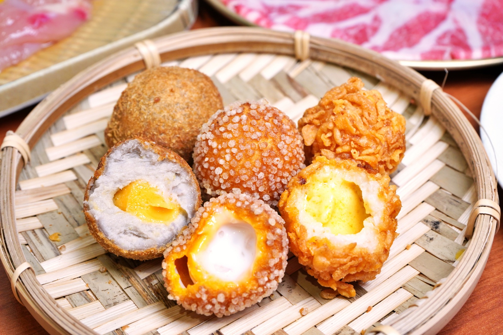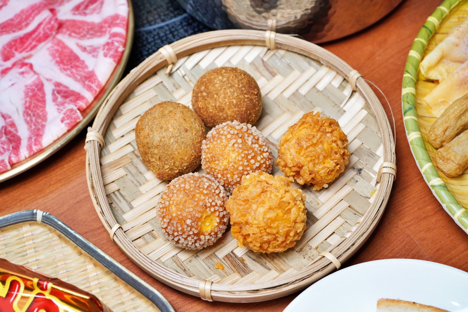 不只是火鍋好吃,蝦球、芋泥球與流心球也讓我們相當驚豔!彈牙蝦球包裹鹹蛋黃、香濃的芋泥球則包裹著奶香起司,流心球裡面更是包入了椰奶西米露。
