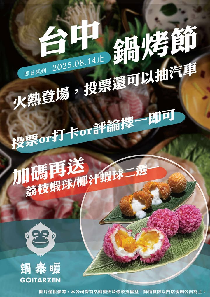 即日起至08/14台中鍋烤節火熱登場,只要支持鍋泰暖,投票不但能抽汽車,加碼再送你們荔枝蝦球或椰汁蝦球哦!