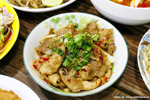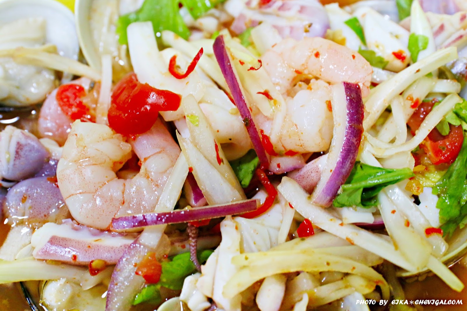 涼拌海鮮拼盤($150),夏天最適合來吃點涼拌的料理了!海鮮拼盤當中有著鮮甜的蝦肉,以及大顆飽滿的蛤蜊,搭配上南洋風味的香料,吃來有點微酸,還帶點類似香茅的清香,辣度也很爽口!