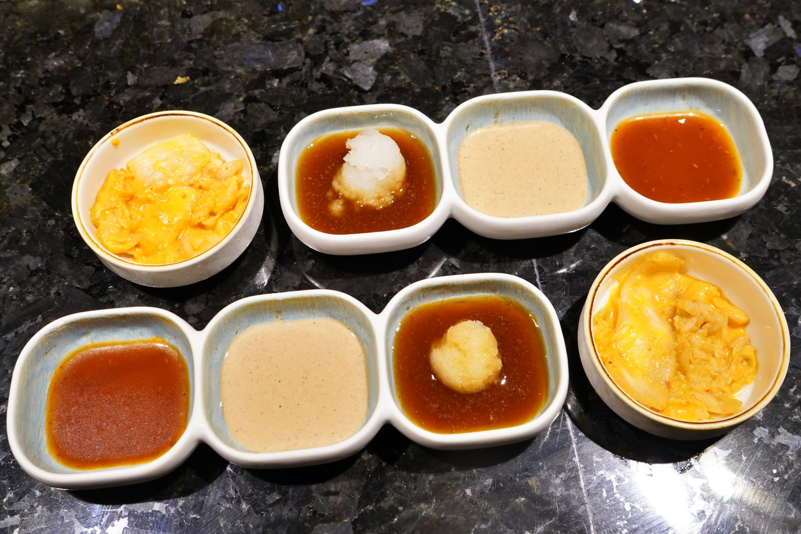 除了一入座送上的無糖熱麥茶,這裡的沾醬選擇也一應俱全,橙汁燒肉醬的果香清爽,搭豬肉與蔬菜最合拍;香濃滑順的胡麻醬與牛肉也很搭;微酸開胃的椪醋則是特別適合搭配海鮮。黃金泡菜更是清甜爽脆又不失多汁。