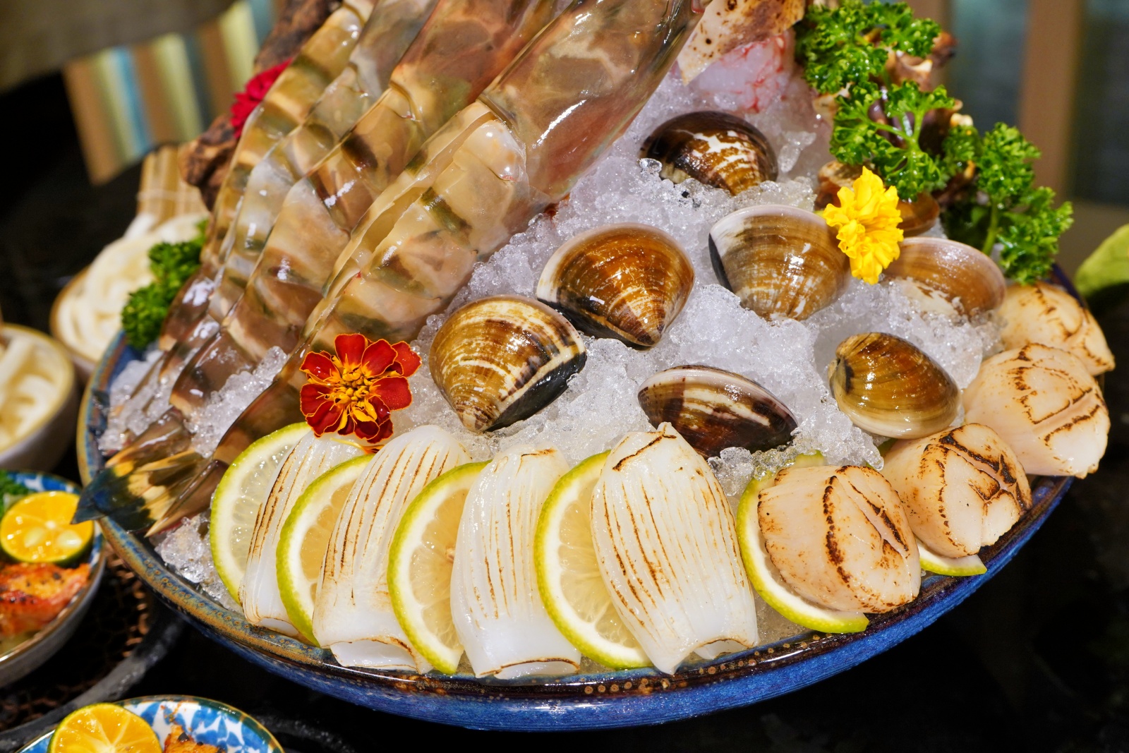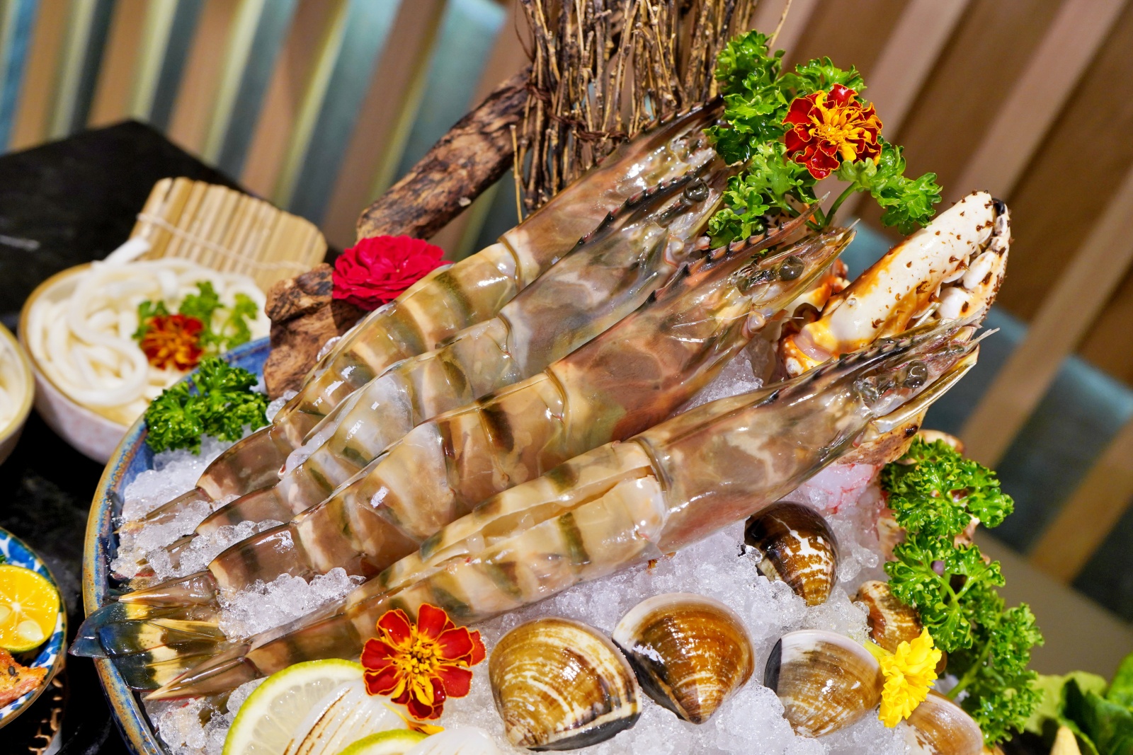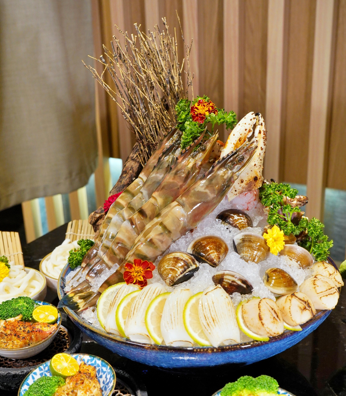 海鮮盤一上桌,整個桌面瞬間成了焦點。帝王蟹鰲、海虎蝦、干貝、紋甲花枝、台灣海大蛤,由專人現切擺盤,精緻得像藝術品!