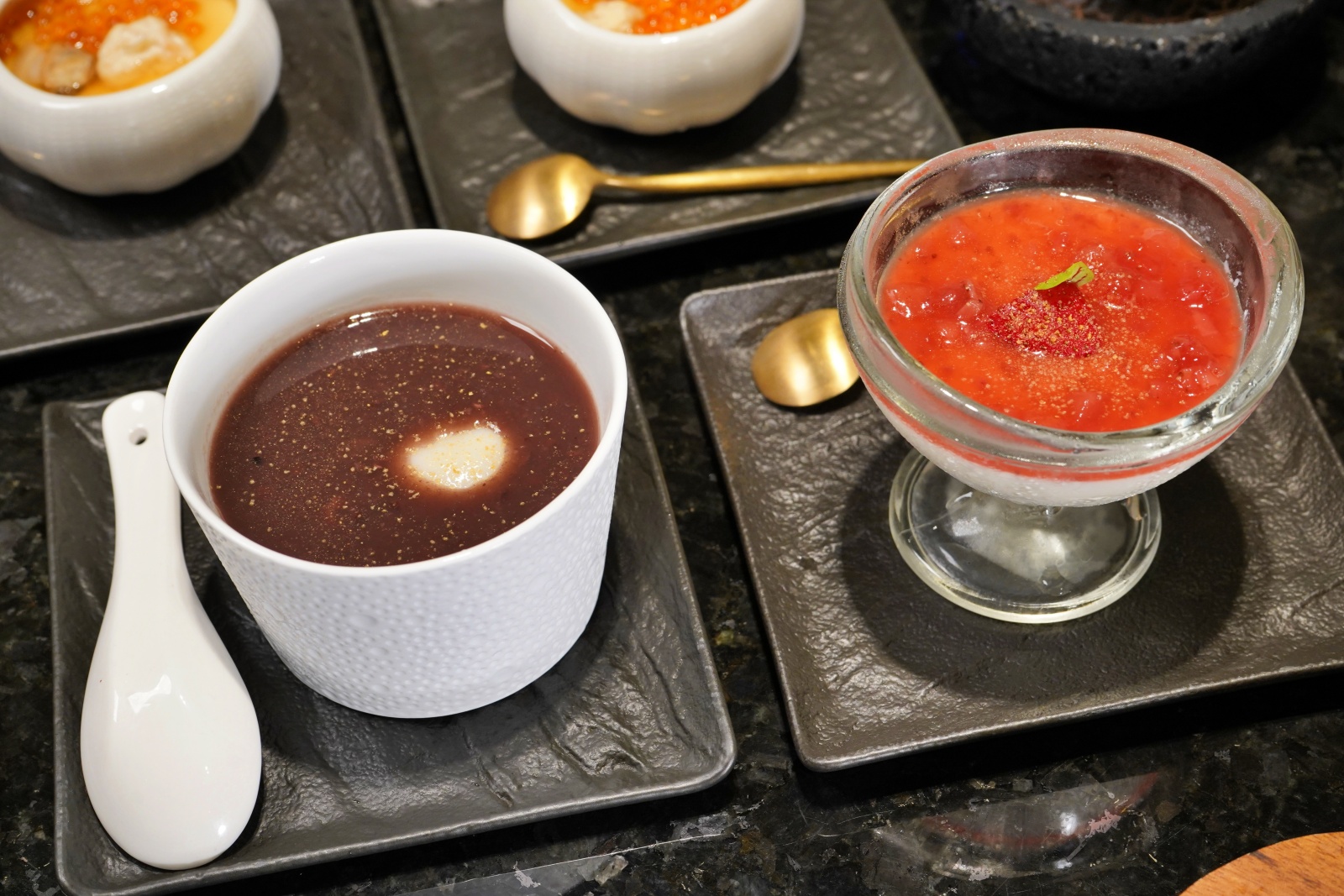 最後以甜點為這場饗宴劃下柔美的句點,一熱一冷,兩種風味各自綻放:紫米紅豆湯圓溫潤香甜,湯圓Q彈軟糯,暖心又滿足;草莓奶酪帶有滑順奶香,並以清新酸甜的果香收尾,分享給你們參考喲!
