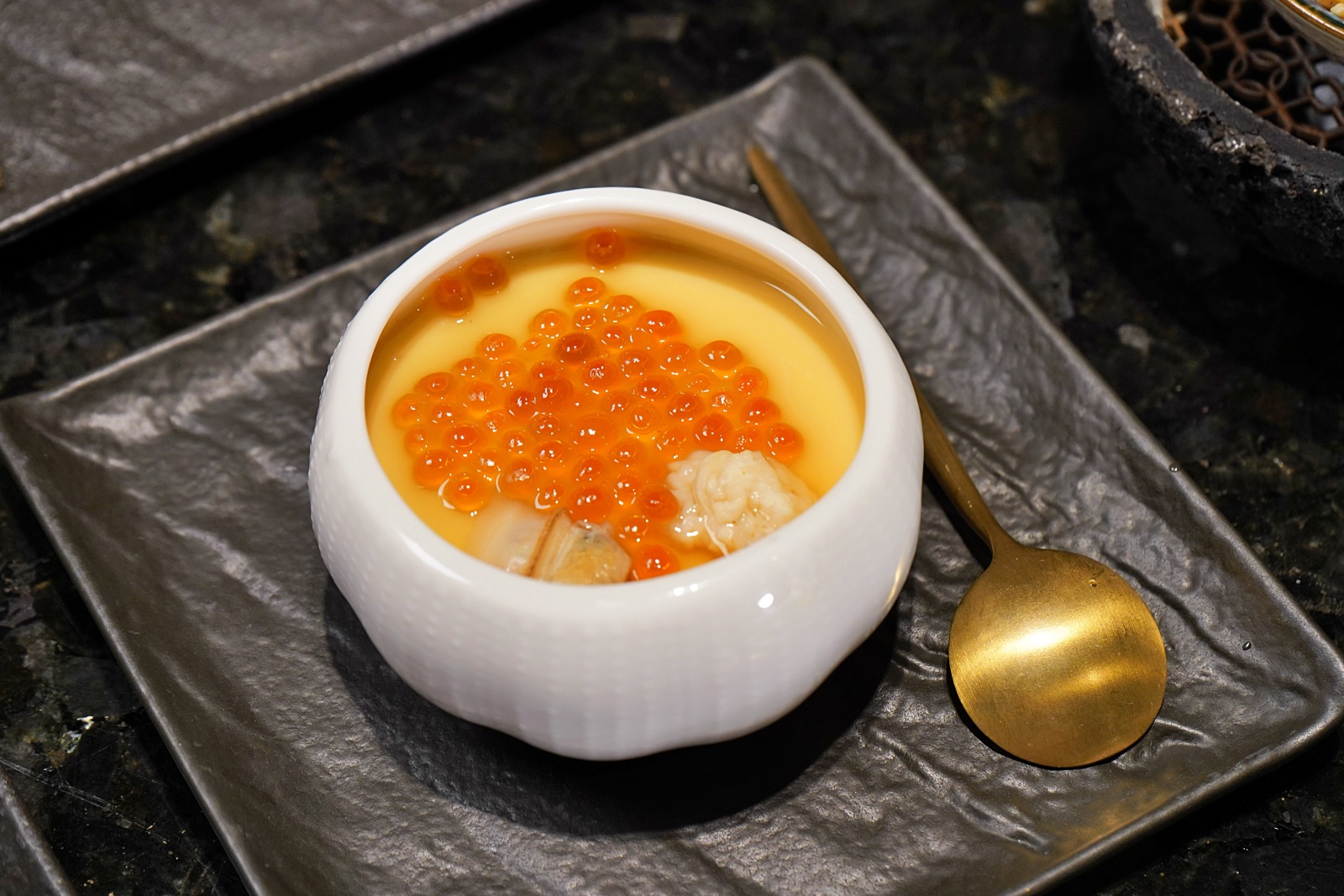 作為前菜的茶碗蒸口感滑嫩如絲,蛋香細緻帶著微微高湯的旨味。頂層鋪上帝王蟹肉絲與飽滿的鮮甜蛤蜊,鮭魚卵則在熱氣中微微爆開,每一匙都是溫潤、鮮甜與微鹹的完美平衡。