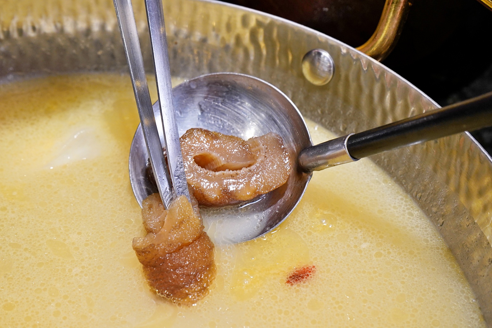 花膠雞湯組合除了雞湯湯底之外,還有滿滿一整份海參、花膠與華陀雞,加入湯底之後,整鍋湯多了層細緻的海味與膠原感,那種「入口即潤」的口感,可以說是秋冬進補的完美首選!
