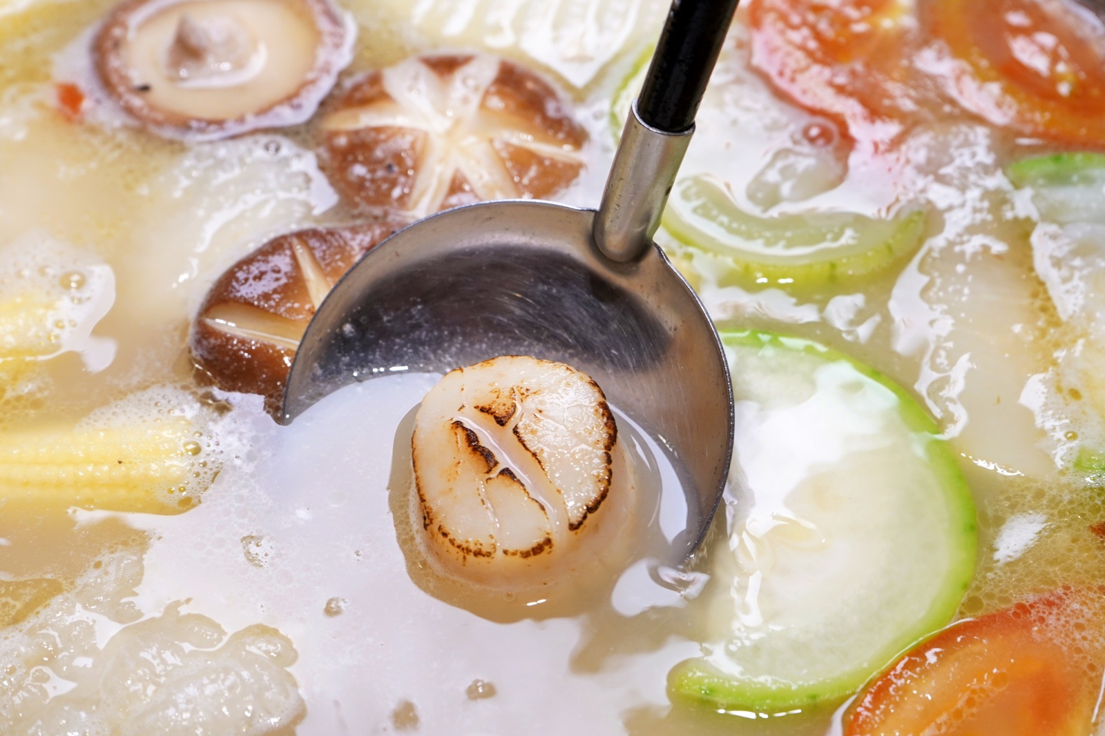 台灣海大蛤的肉質柔嫩飽滿,一放進鍋裡,整鍋湯的鮮味層次立刻提升不少。紋甲花枝更是讓魚編一吃就愛上,極致的彈脆咀嚼感,實在讓人欲罷不能!
