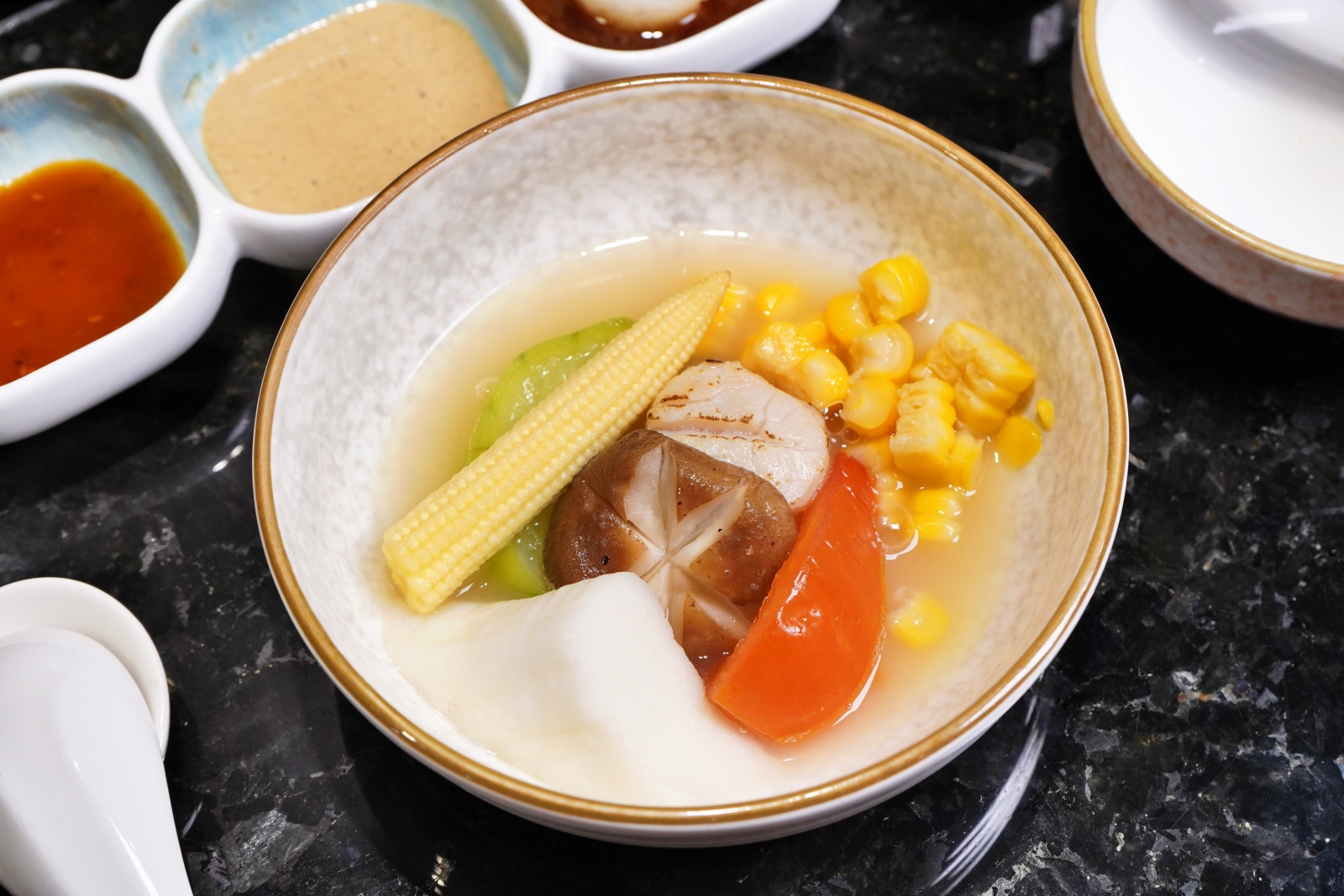 整鍋湯上桌時,湯色金潤澄澈,湯面浮著晶亮的膠質光澤。以老母雞、豬腳、金華火腿與干貝長時間細火慢熬,香氣溫潤不張揚,卻能在第一口時滲進喉間,留下淡淡鹹香與鮮甜。吃到後面再加入綜合蔬菜,湯頭更顯溫潤甘甜。