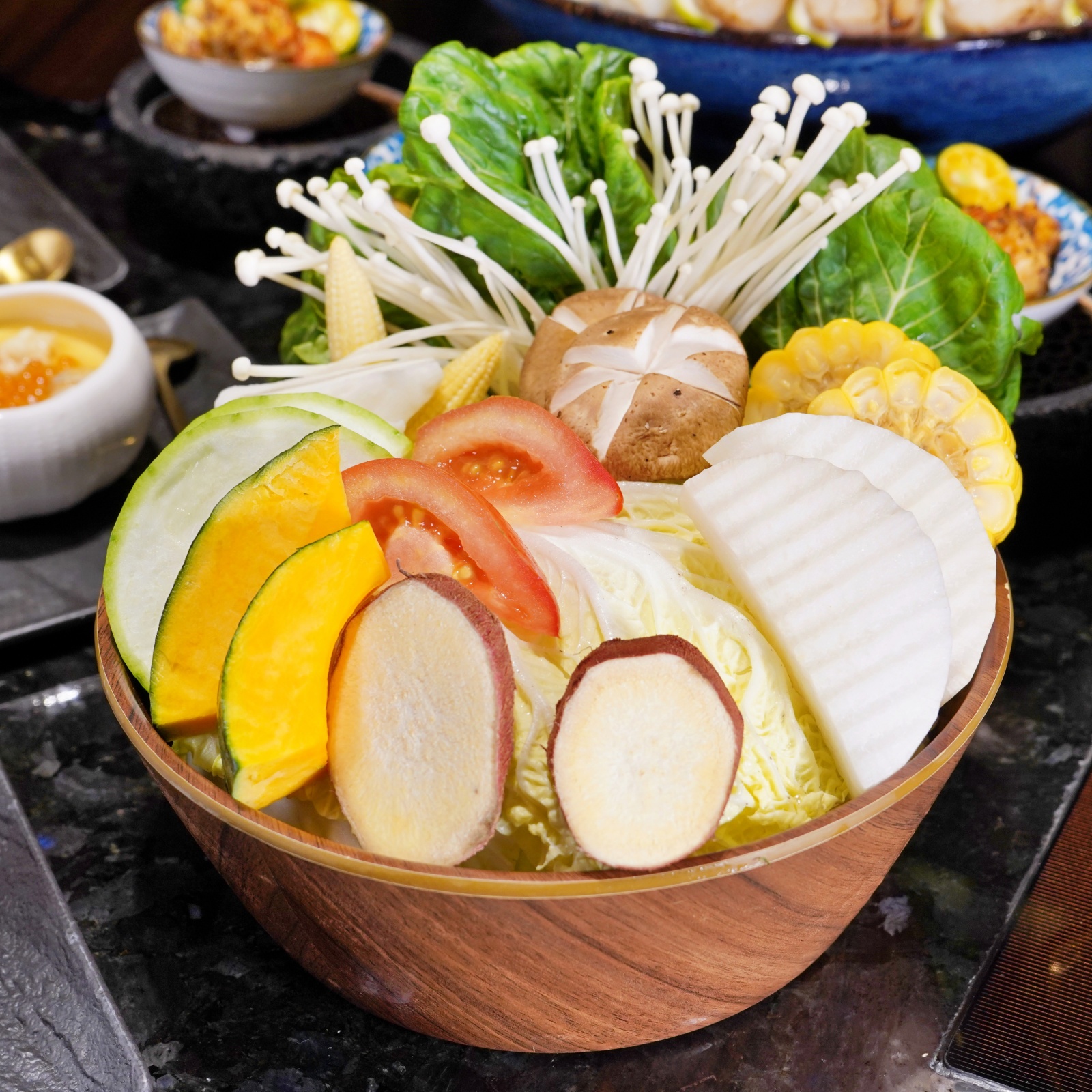 綜合蔬菜盤嚴選了當季鮮蔬,從娃娃菜、高麗菜、金霜玉米、栗子南瓜、香菇、金針菇到玉米筍都能吃得到,其中金霜玉米更是驚豔,可以說是魚編目前吃過最為鮮甜多汁的玉米了!