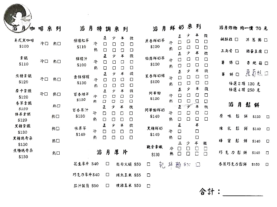 這裡提供滔月景觀咖啡廳目前最新的菜單給你們參考,不過因為近期試營運會依情況調整品項,所以還是要以實際看到的菜單為準哦!