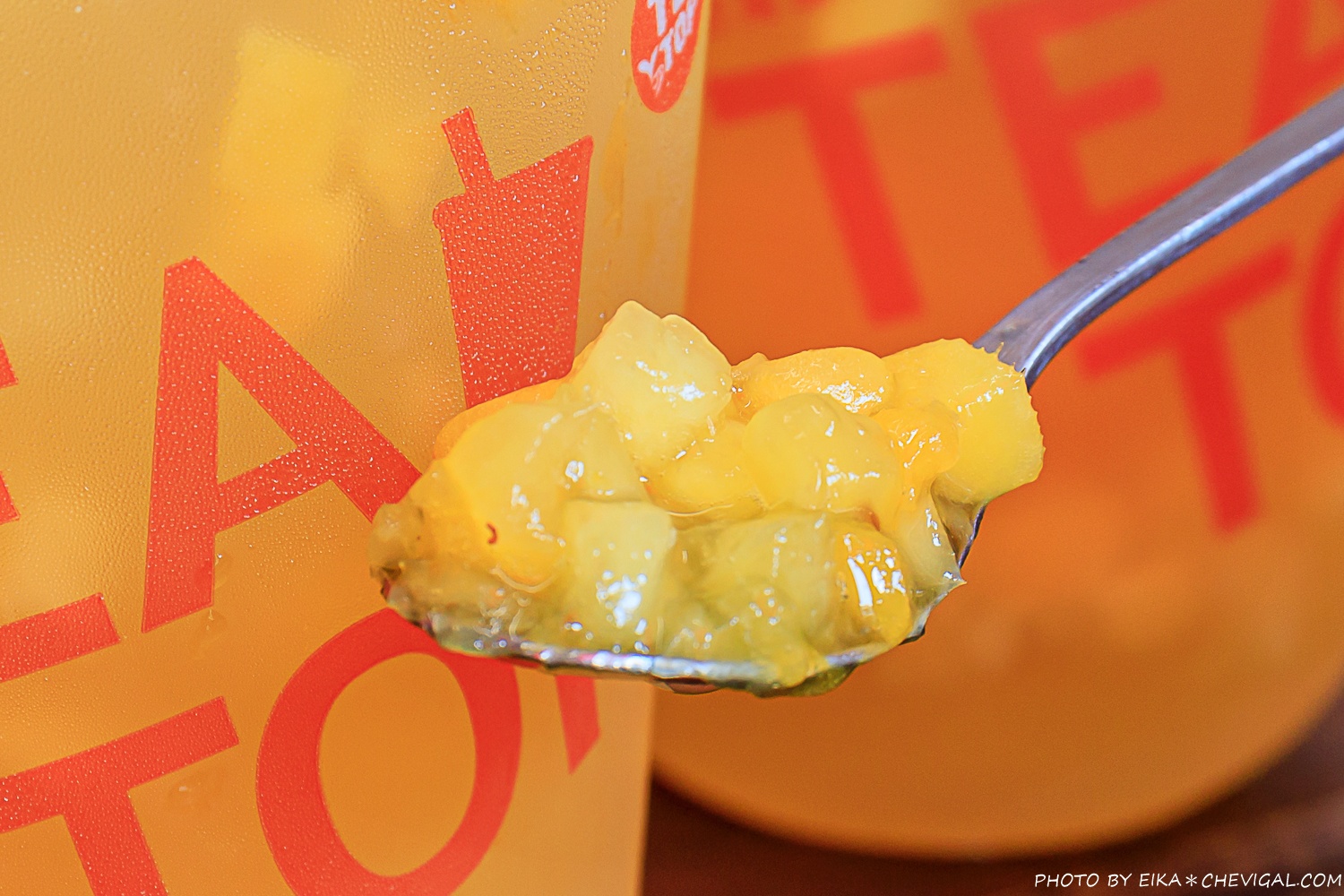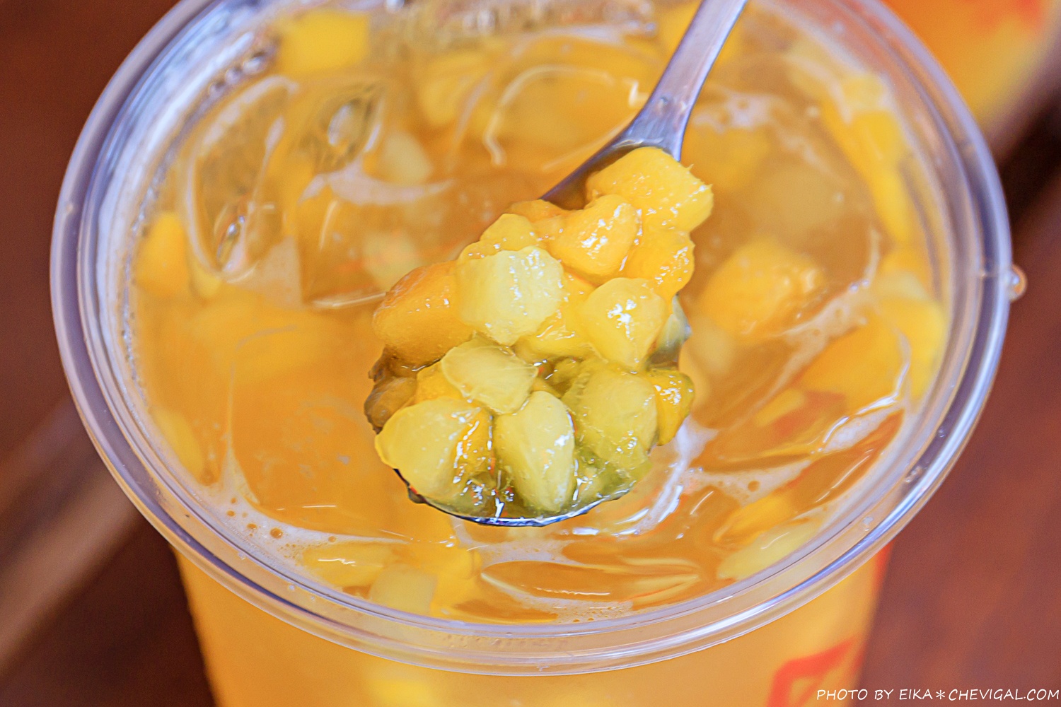 我們這天點了兩杯芒果鳳茶來嚐鮮,杯子的容量固定為中杯500c.c.,圓滾滾的杯身造型搭配上黃澄澄的鮮豔色澤,在炎炎夏日裡顯得格外繽紛又消暑!