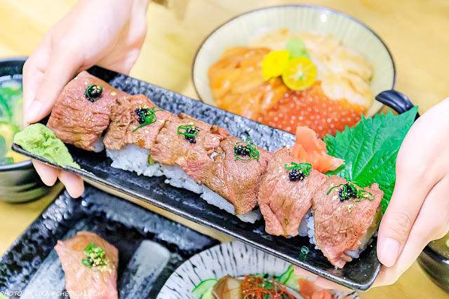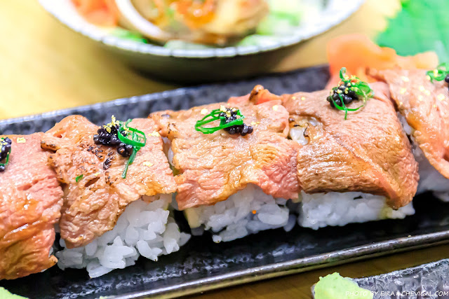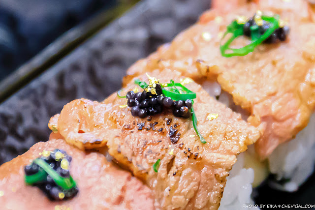 金沙日本A5和牛佐魚子醬捲壽司$680元,最近發現台中的捲壽司與握壽司都開始流行一波奢華路線,日本和牛已經是基本款,搭配魚子醬與食用金箔更是多了幾分新奇與期待的感受!