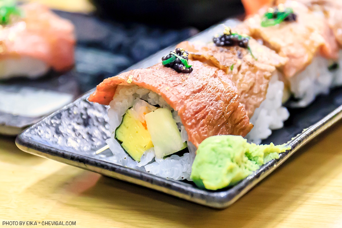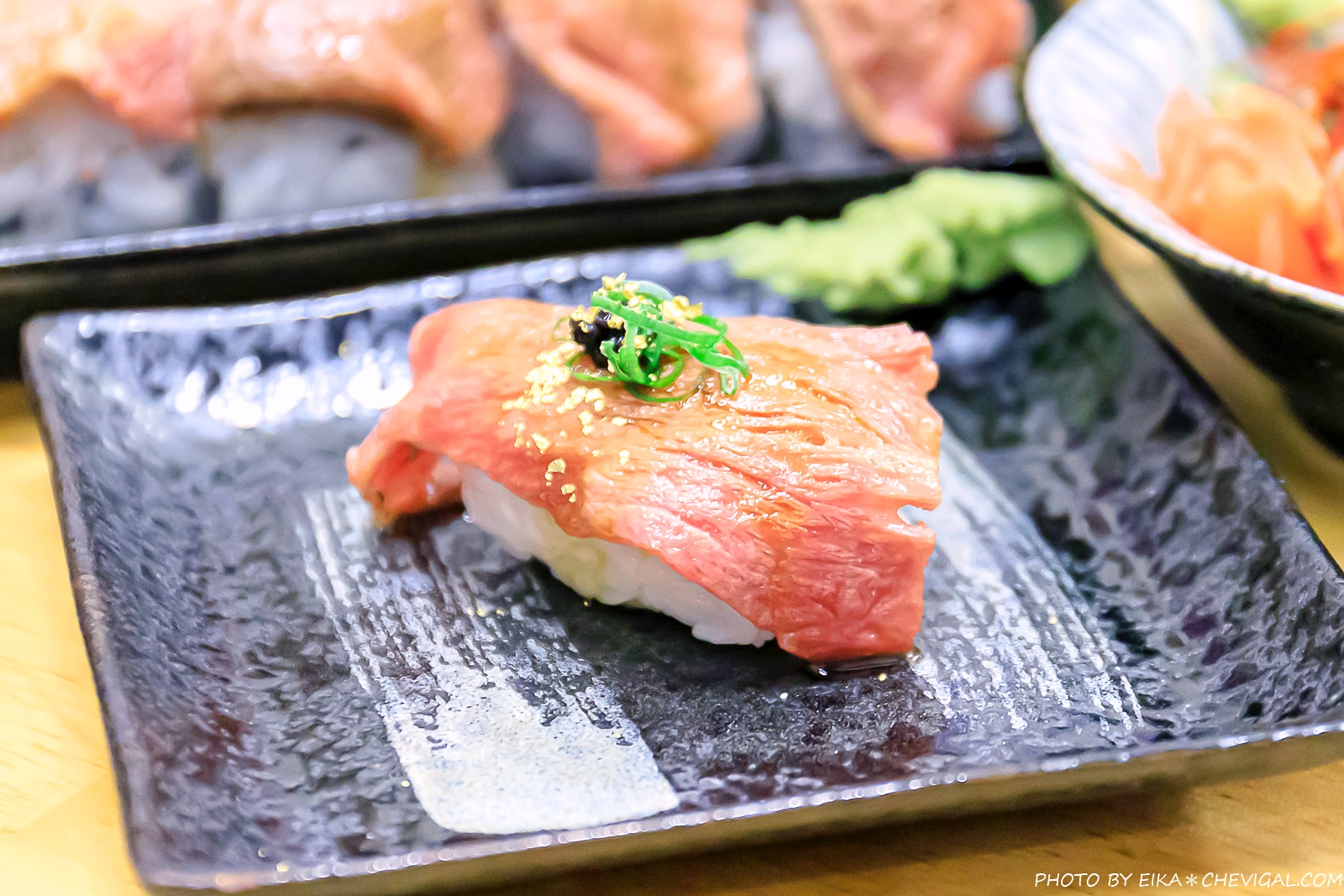 金沙日本A5和牛佐魚子醬捲壽司$680元,最近發現台中的捲壽司與握壽司都開始流行一波奢華路線,日本和牛已經是基本款,搭配魚子醬與食用金箔更是多了幾分新奇與期待的感受!