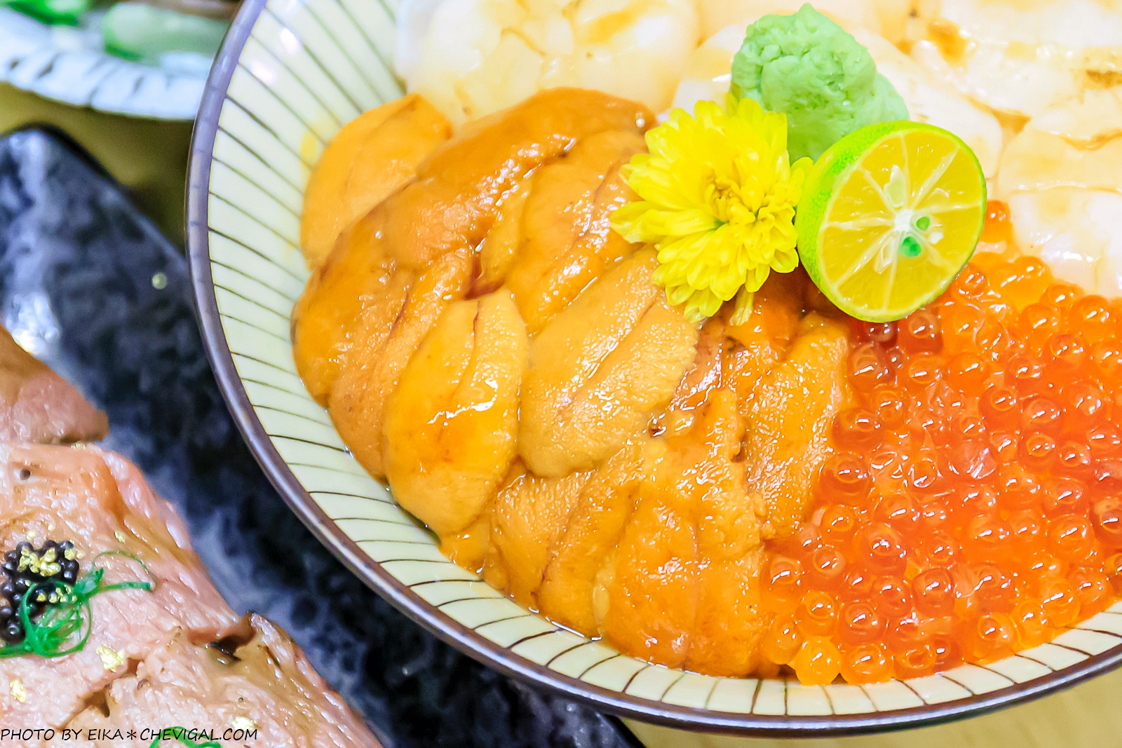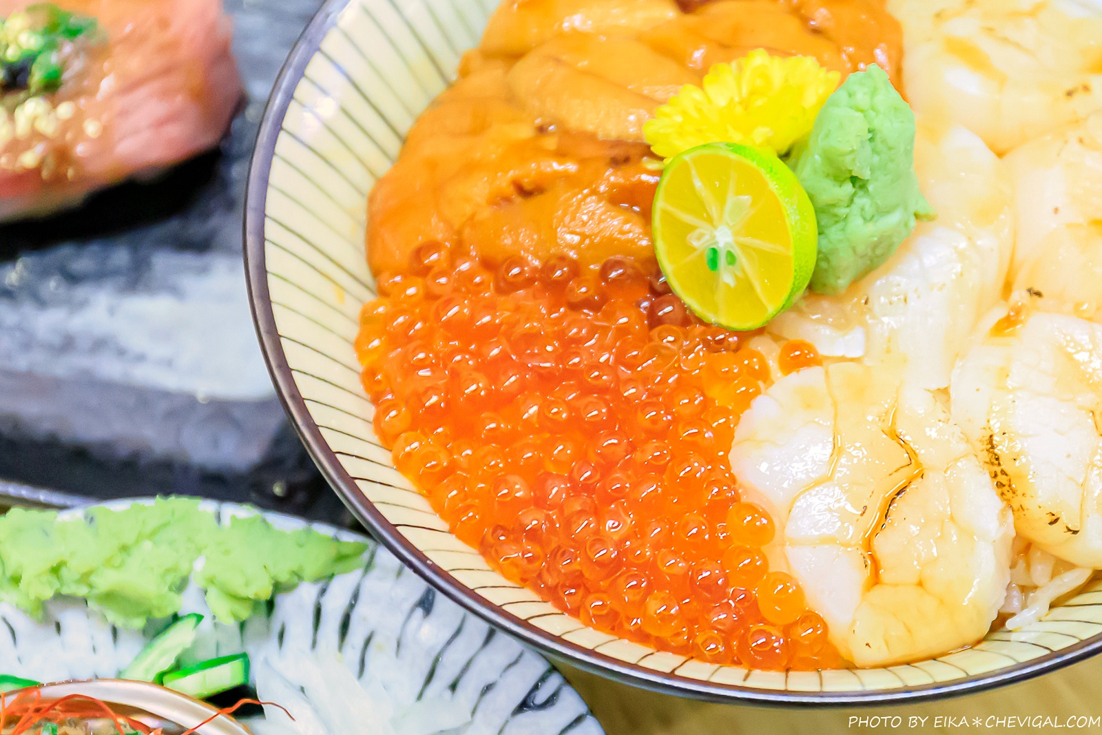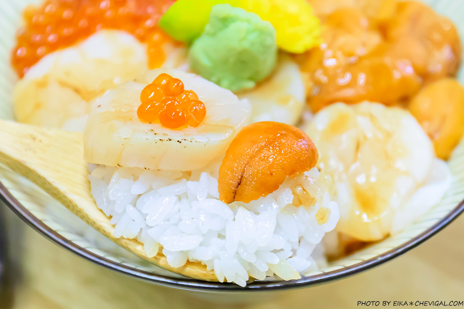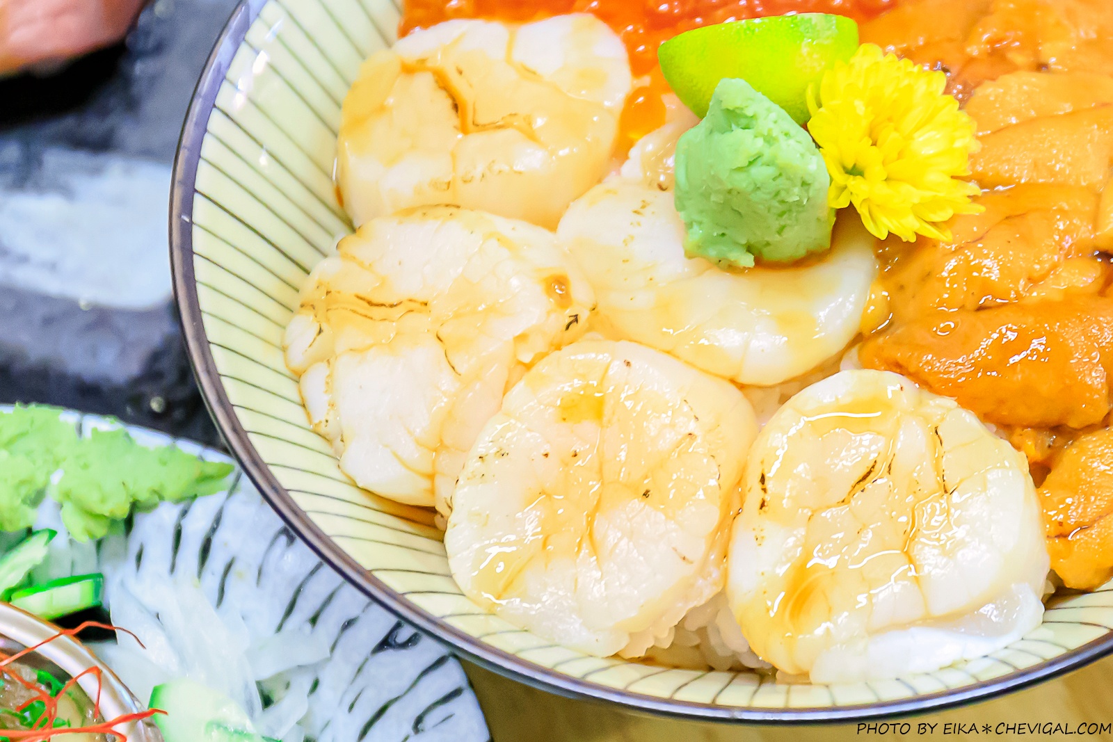 北海道三色丼$680元,許多內行的老饕來店必點這款丼飯!選用來自北海道的根室赤海膽、北海道鮭魚卵與北海道干貝,一整碗的海鮮鋪得滿滿滿,完全看不到底下的醋飯,非常有誠意!