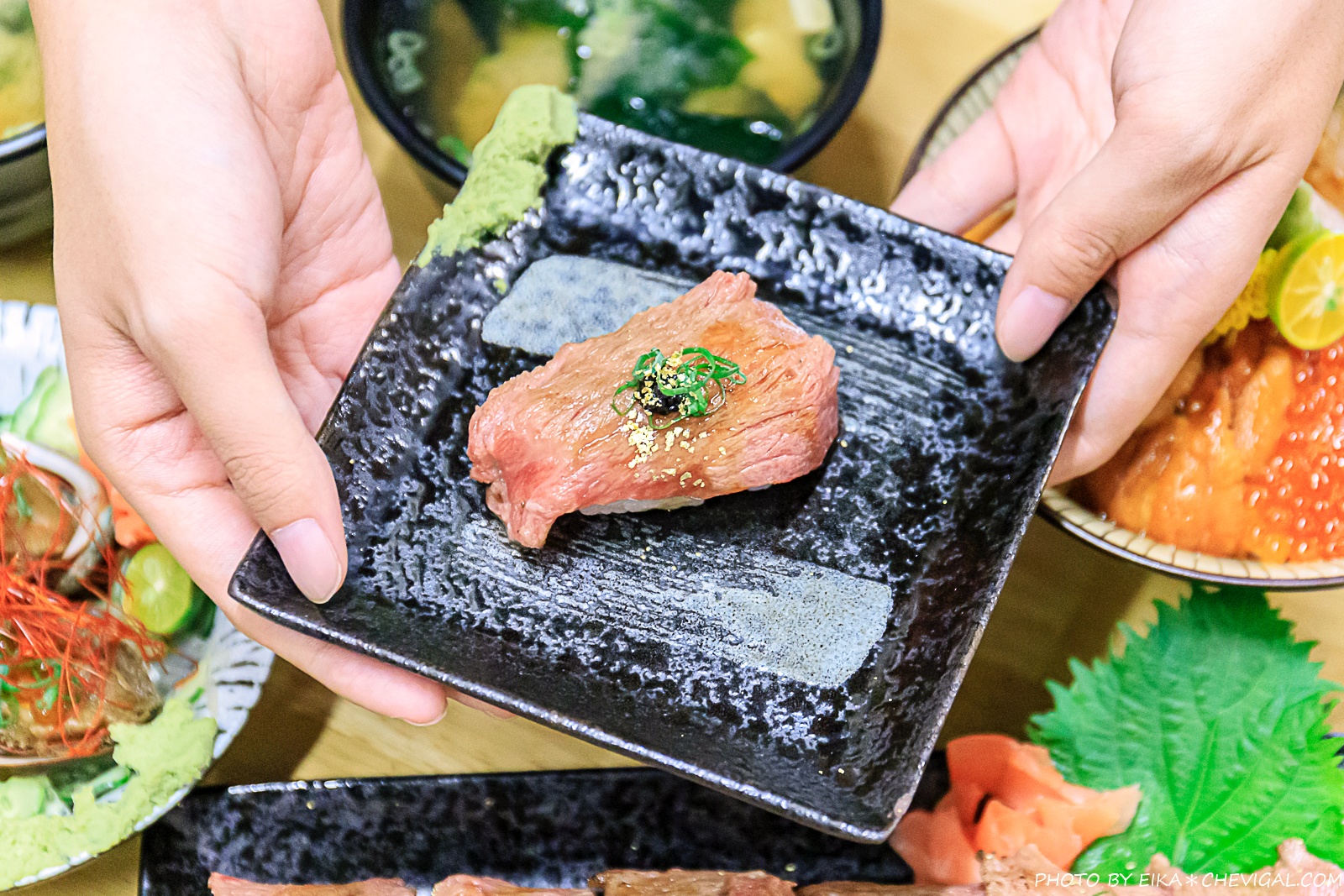 金沙日本A5和牛佐魚子醬握壽司$120元,除了前面介紹的捲壽司之外,也可以簡單地點上一貫相同口味的握壽司來嚐鮮,更能專注於和牛本身的香氣與肉質。