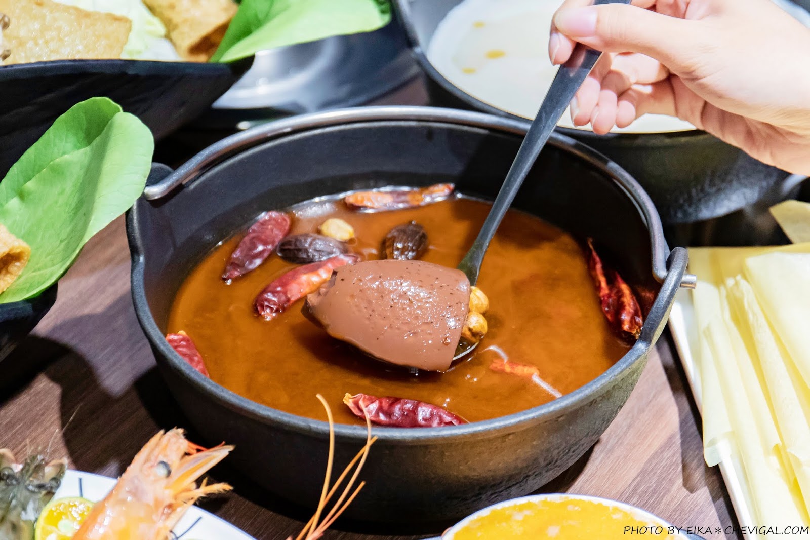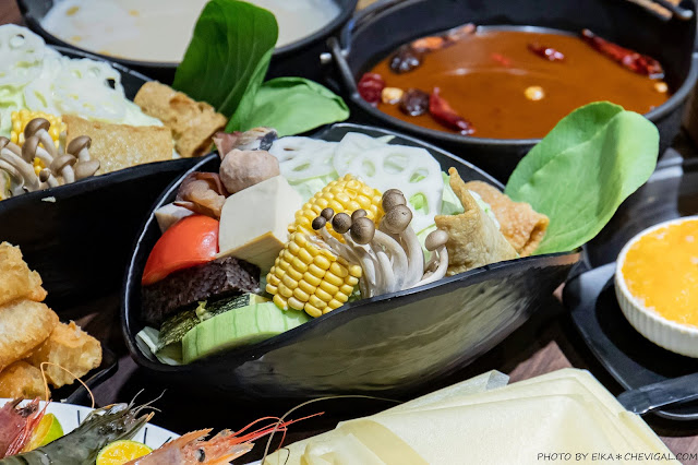 雙人饗鍋可以選擇兩款湯頭,秋冬季節還蠻適合來上一份重慶麻辣湯底!這款據說是以數十種中藥材配製獨家中藥配方,並花費6小時熬煮出來的麻辣醬;雖然不適合直接飲用,但是風味麻而不辣,平常不太敢吃辣的朋友們可以試試。