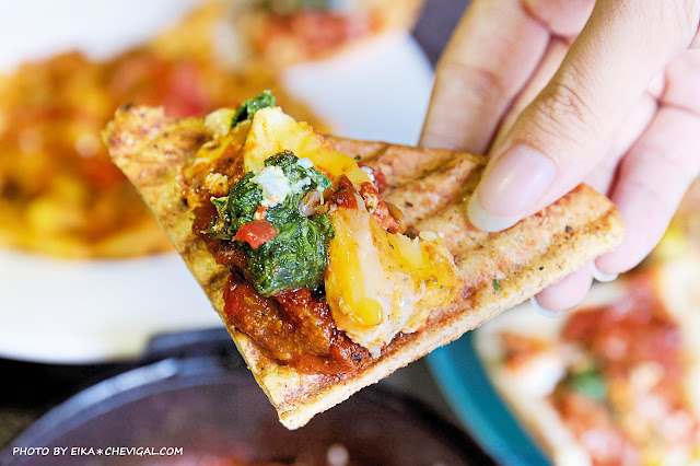搭配的麵包也毫不馬虎,提供烤皮塔餅、熱壓法國吐司與全麥吐司三種選擇,托盤中間還有以香酥松子、鷹嘴豆泥與番茄義大利油醋所調配出來的沙拉,搭配蘇卡夏卡的香料氣味十分濃郁,非常有特色!