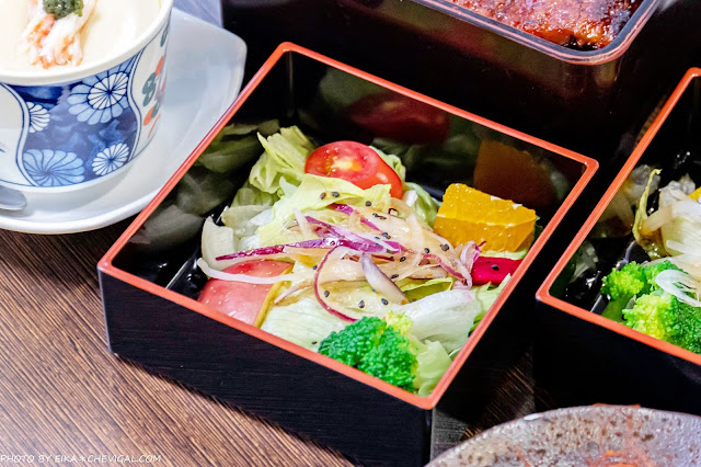 丼飯系列另外均附沙拉、蒸蛋與湯品,這時候就更覺得蒲燒鰻丼真的很超值!沙拉以清新的和風醬汁調味,吃得到生菜的爽脆與水果的沁酸與鮮甜,還挺開胃的。