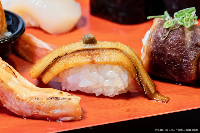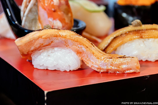 炙燒鮭魚肚的厚度非常有誠意,炙燒過後的油脂香氣又比生魚片來得迷人,肉質不顯柴澀,大口咬下卻也不會感到過於膩口,吃起來的飽嘴感還不錯~